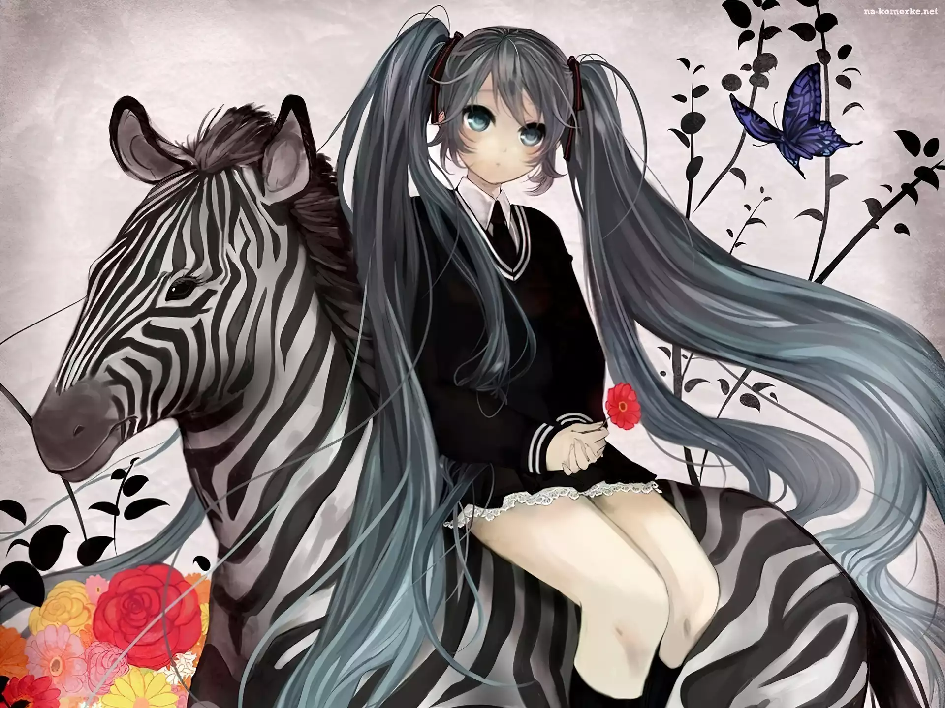 Dziewczyna, Kwiaty, Motyl, Zebra na Komórkę
