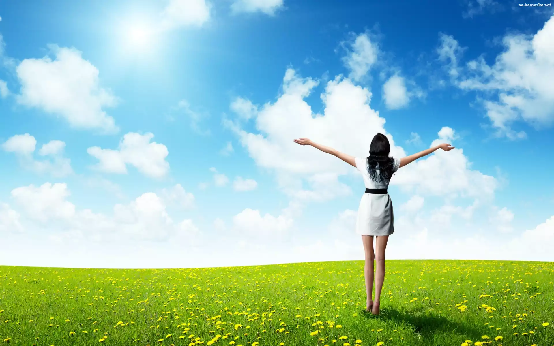 Łąka, Niebo, Dziewczyna, Kwiaty na Komórkę