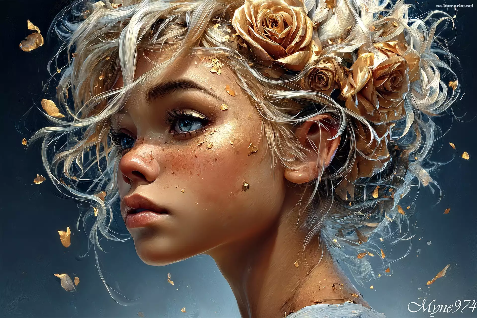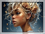 Włosy, Kwiaty, Zamyślona, Grafika AI, Twarz, Upięte, Dziewczyna na Komórkę