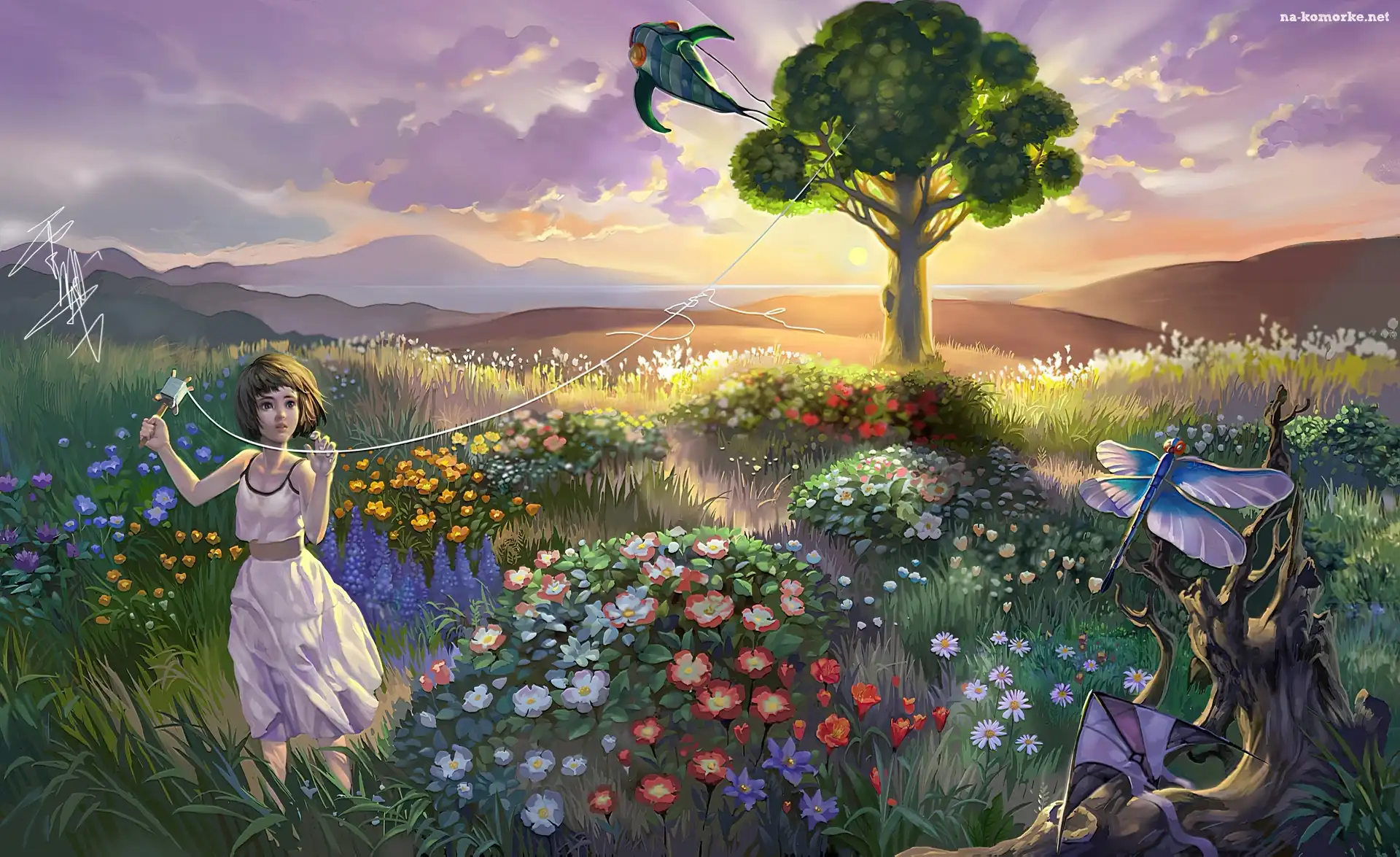 Dziewczynka, Latawiec , Łąka, Kwiaty na Komórkę
