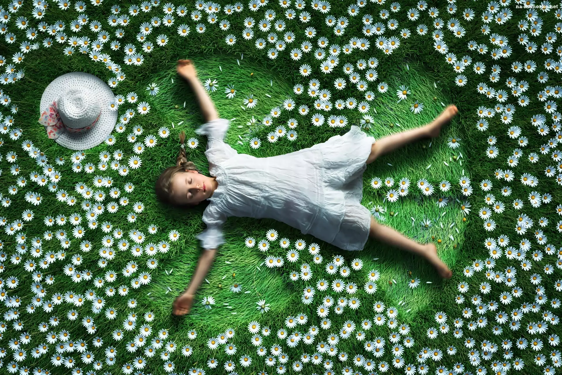 Dziewczynka, Stokrotki, Kapelusz, Łąka na Komórkę