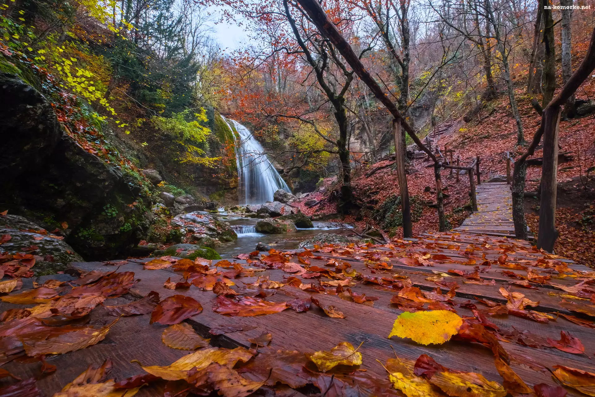Wodospad Dżur-Dżur, Jesień, Krym, Rzeka Ułu-Uzeń, Pomost, Las, Drzewa na Komórkę