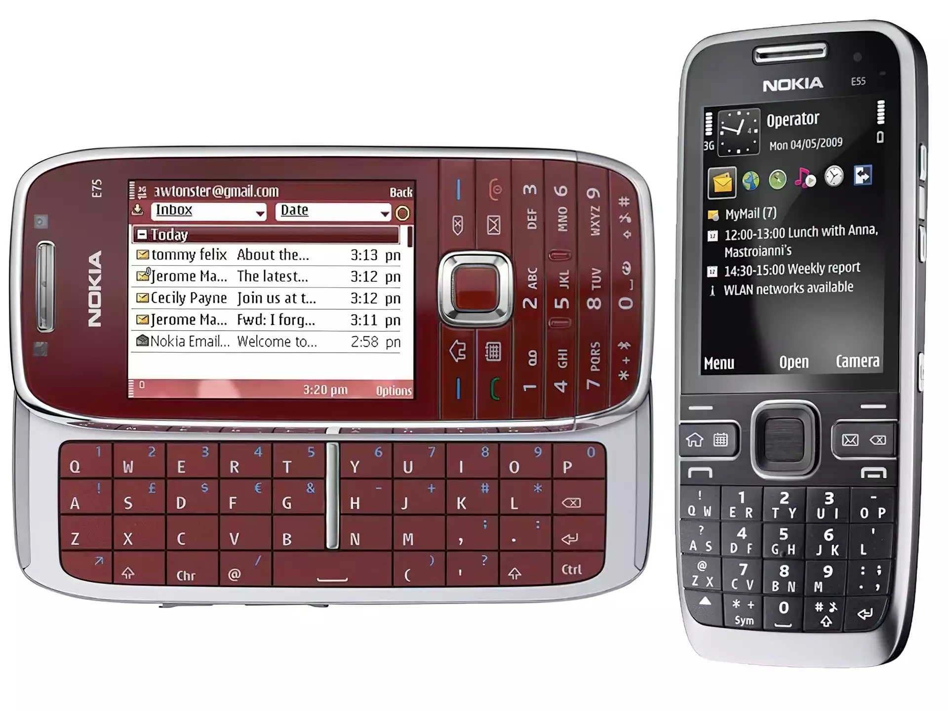 Nokia E55, Czarna, Przód Nokia E75, WLAN, Czarny, Srebrny Nokia E75, Wiśniowy, Czarny, Brązowy Nokia E75, Czarny Nokia E55, Wiśniowy, Nokia E55