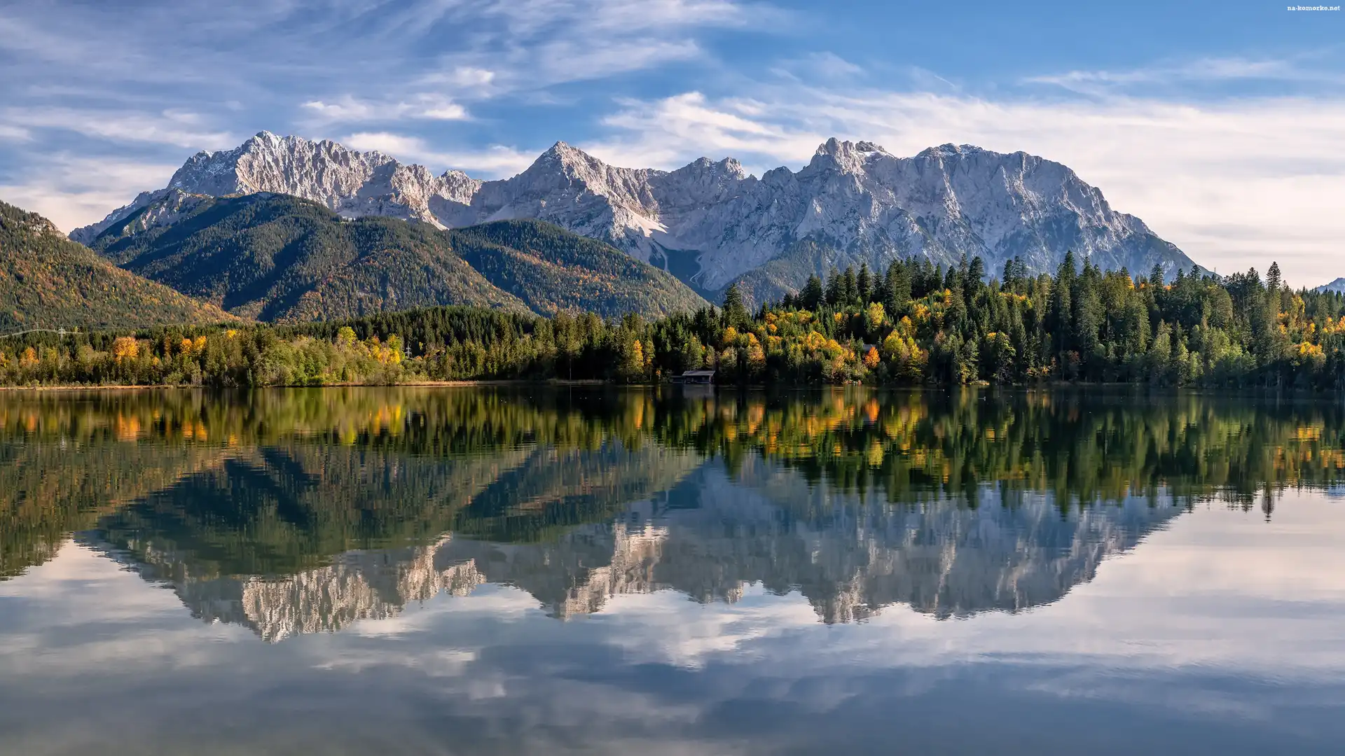 Niemcy, Las, Drzewa, Bawaria, Góry, Pasmo Karwendel, Jezioro Eibsee na Komórkę
