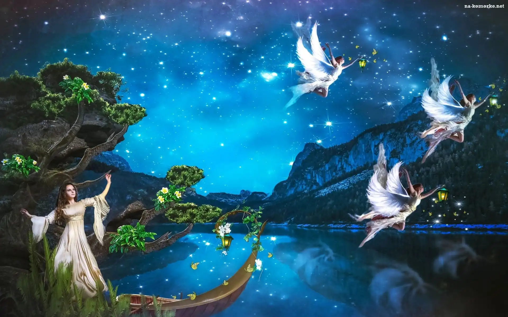 Jezioro, Fantasy, Gwiazdy, Drzewa, Dziewczyna, Góry, Aniołki, Noc, Elfy na Komórkę