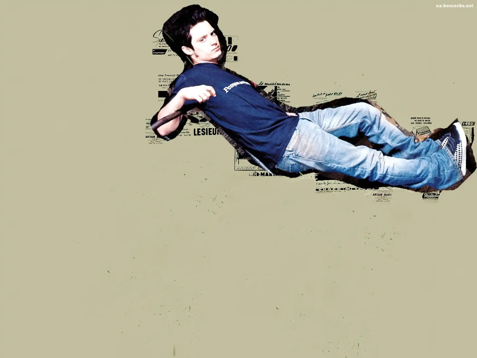 Elijah Wood, niebieski t-shirt, jeansy na Komórkę