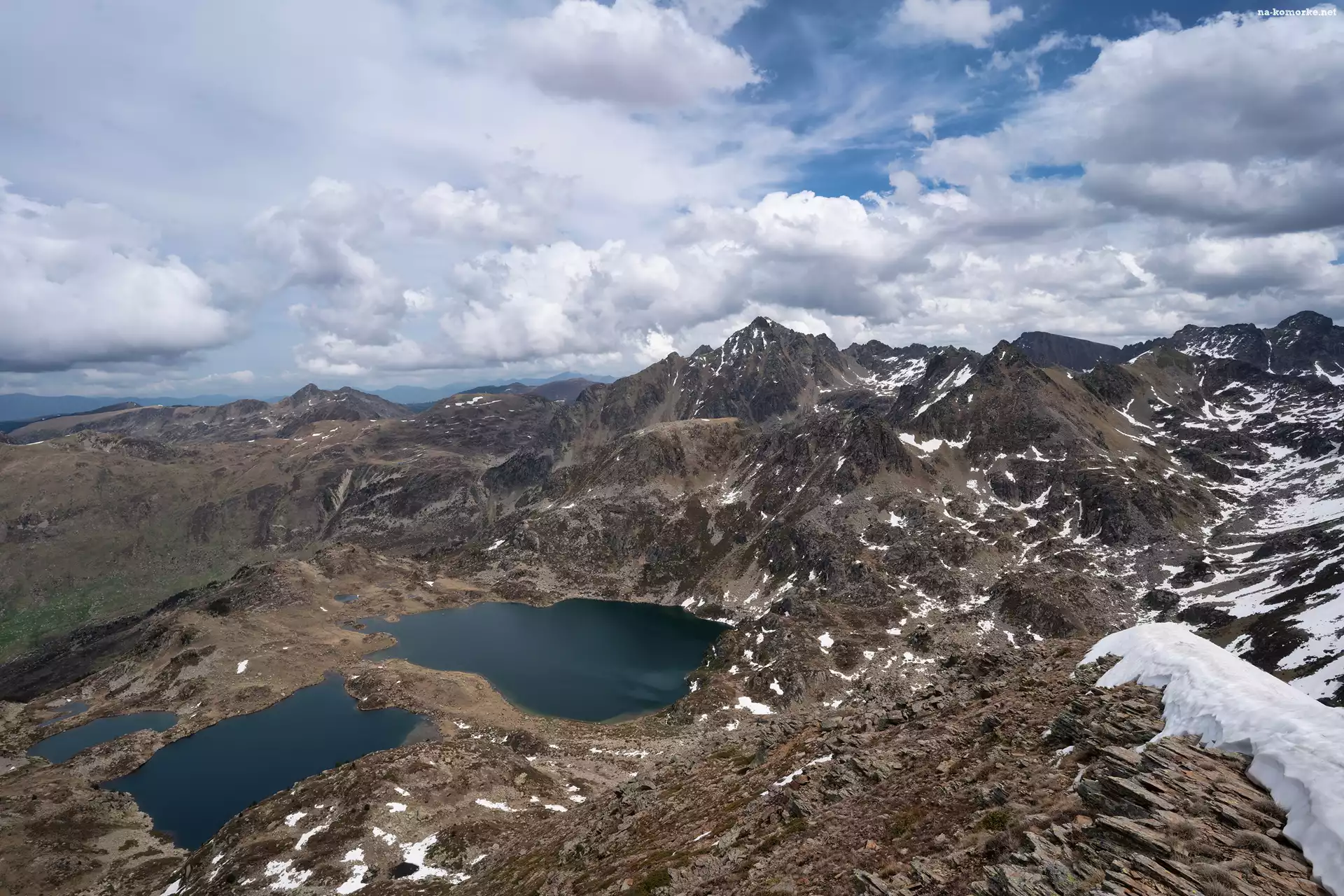 Jeziora, Śnieg, Góry, Francja, Pireneje, Niebo, Etangs de Fontargente, Dolina Aston na Komórkę
