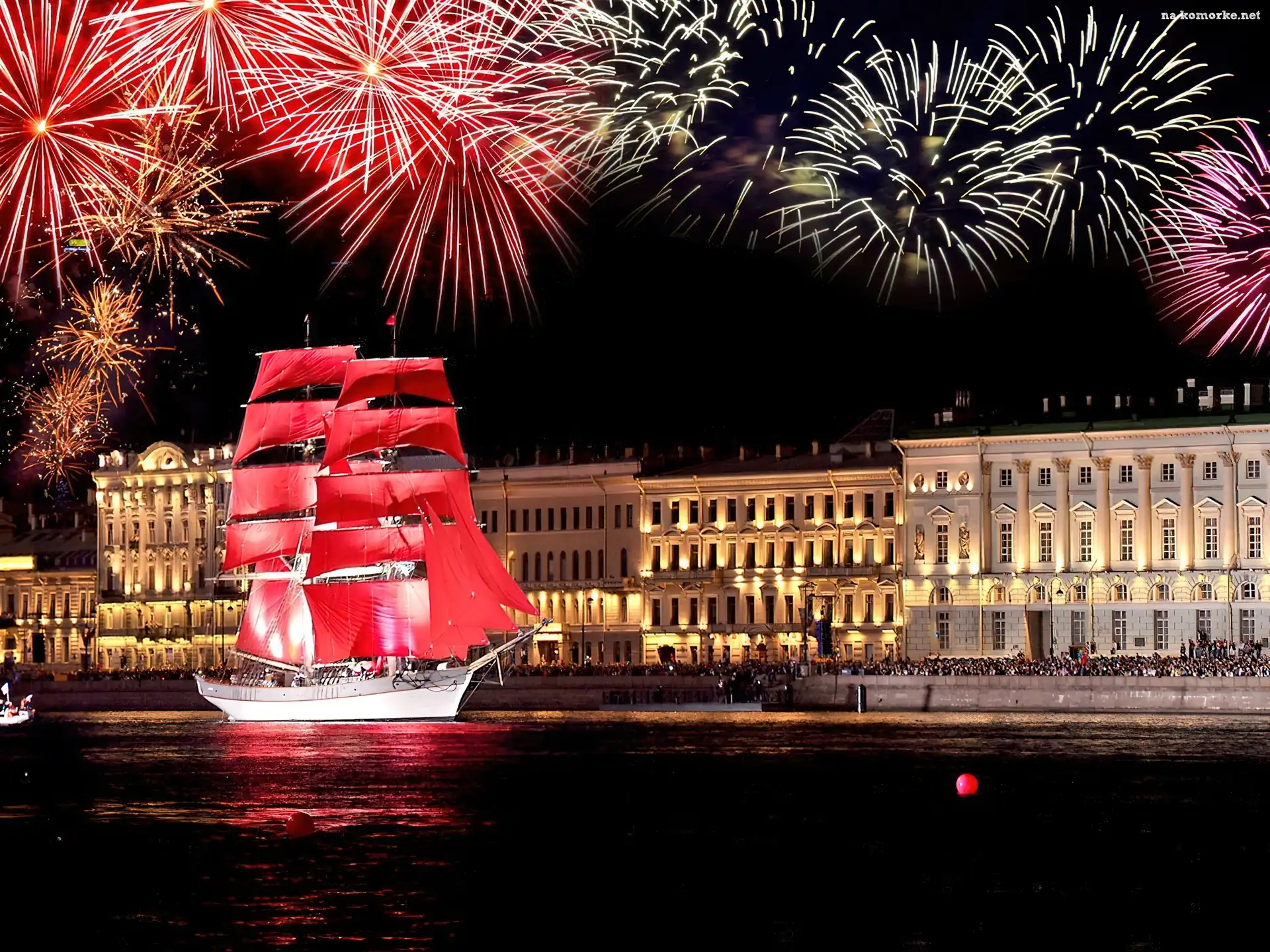 Fajerwerki, Żaglowiec, Czerwone, Żagle, Noc na Komórkę