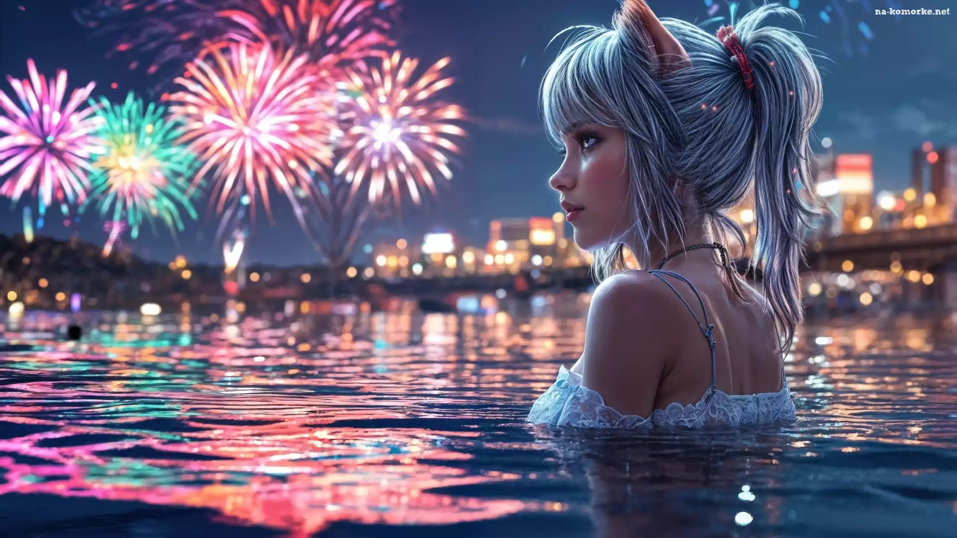 Miasto, Dziewczyna, Rzeka, Fajerwerki, Włosy, Jasne na Komórkę