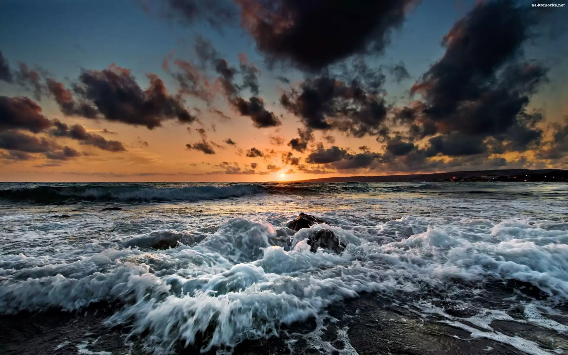 Fale, Zachód, Słońca, Chmury, Morze na Komórkę