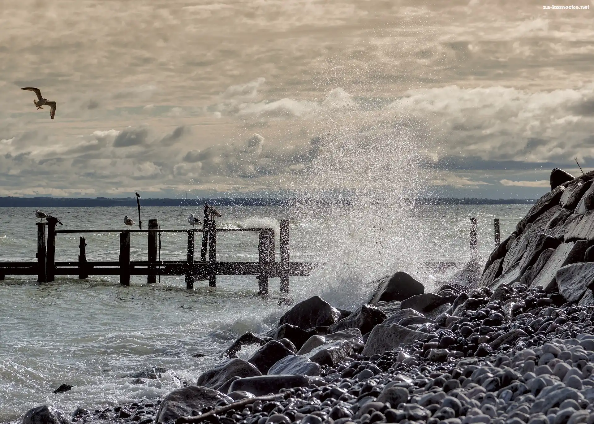 Fale, Pomost, Kamienie, Chmury, Mewy, Skały na Komórkę