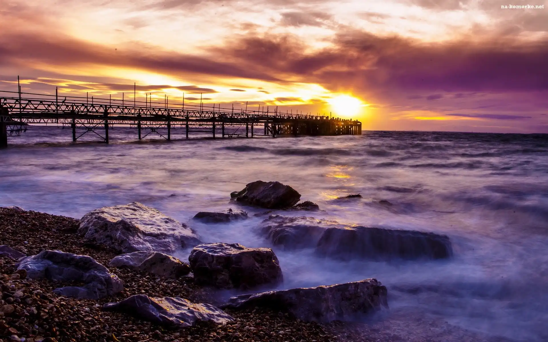 Fale, Molo, Chmury, Zachód Słońca, Skały na Komórkę