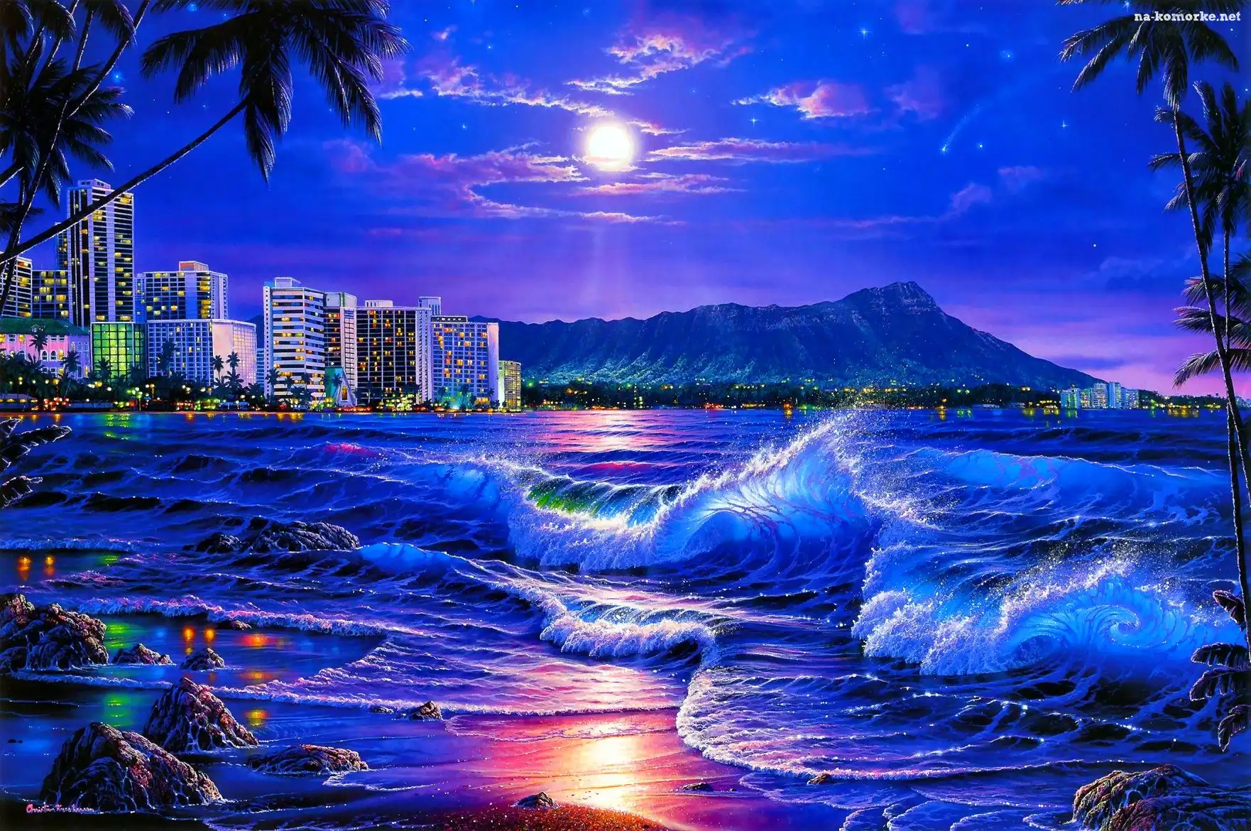 Fale, Noc, Wybrzeże, Miasto na Komórkę
