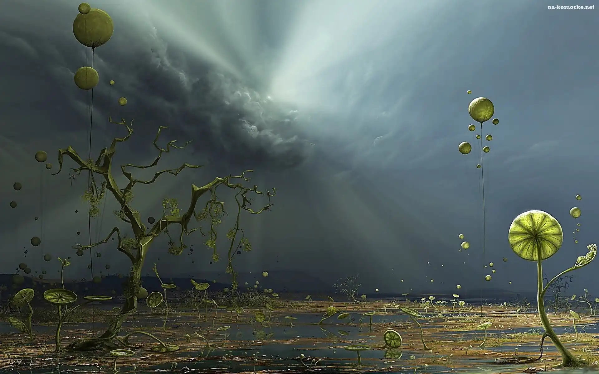 Rośliny, Fantasy, Grafika komputerowa, Promienie słońca, Drzewa, Chmury na Komórkę