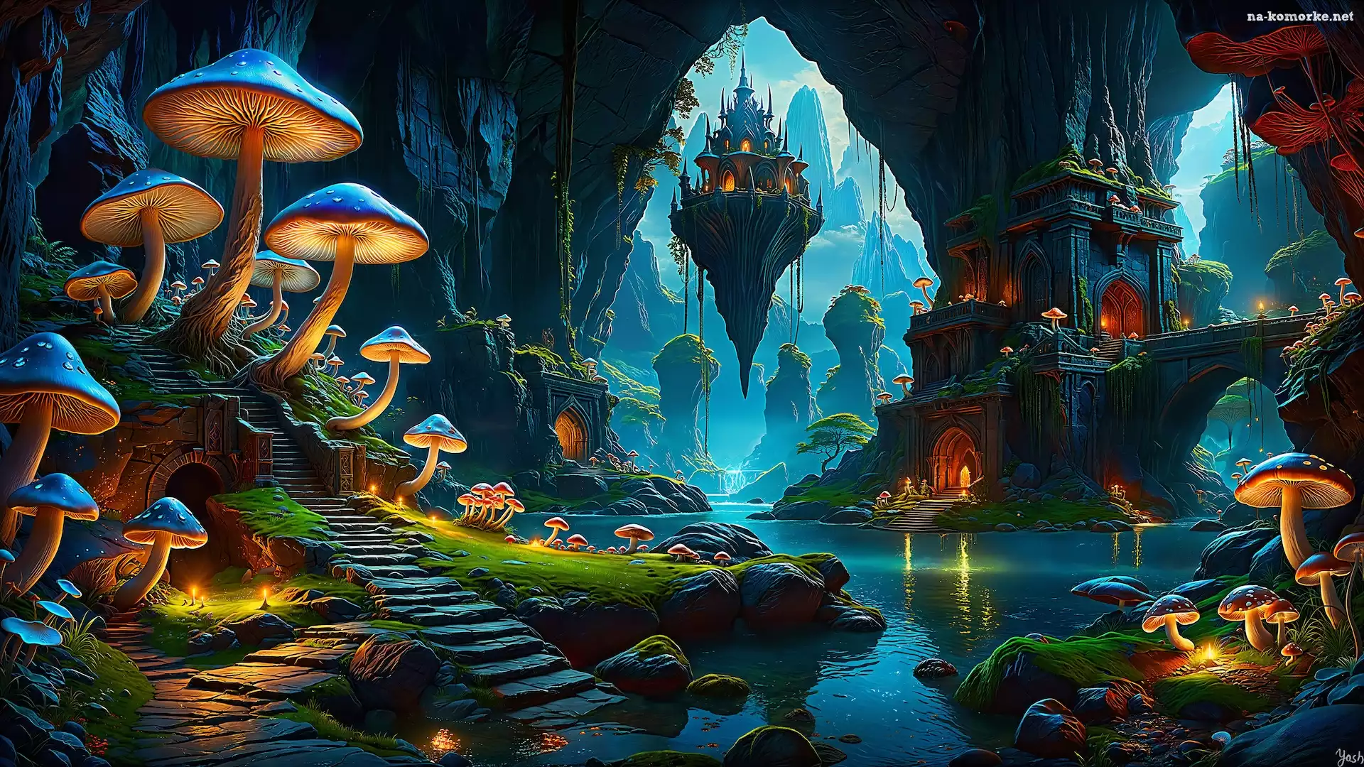 Schody, Rzeka, Grzyby, Fantasy, Drzewa, Jaskinia na Komórkę