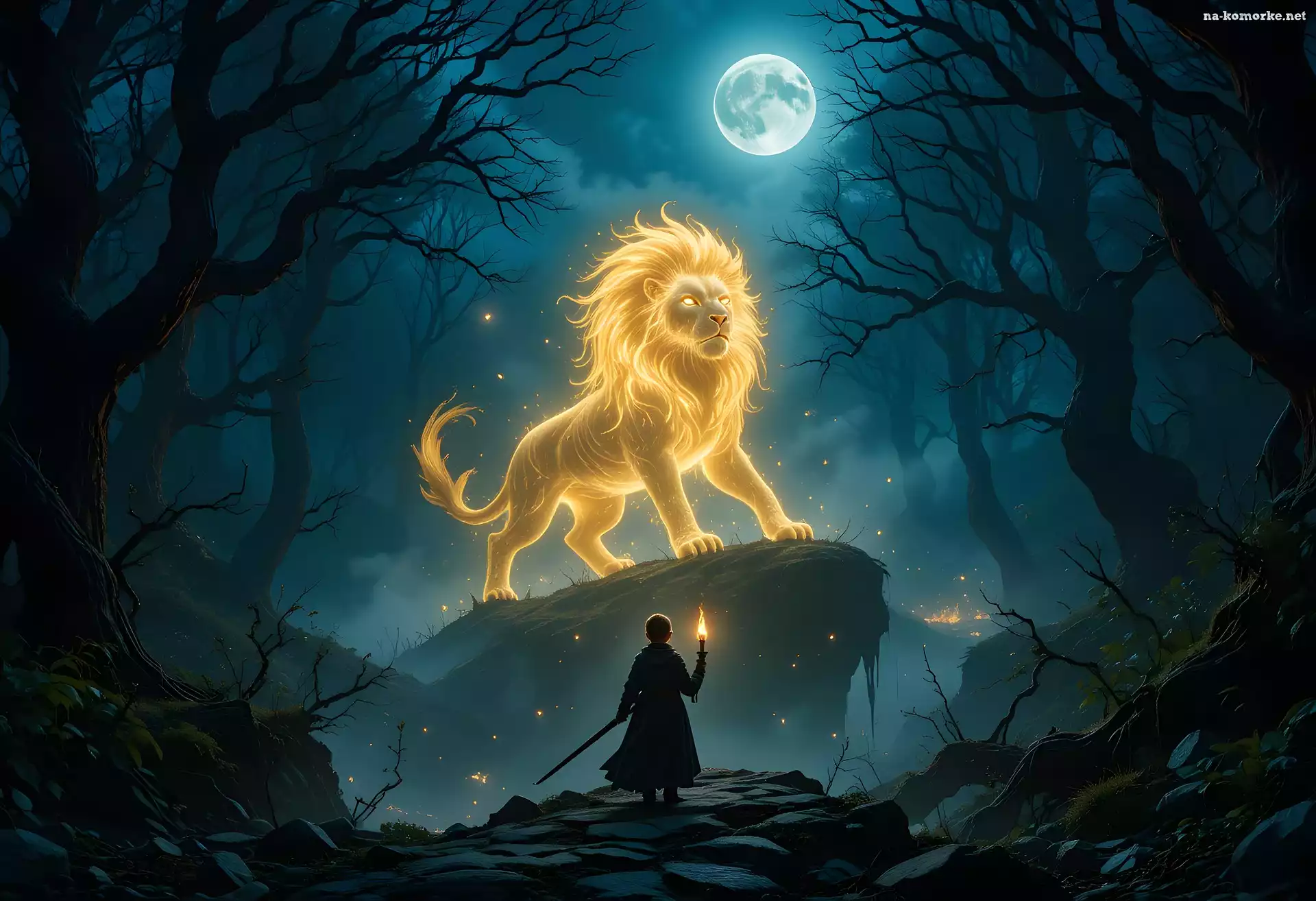 Dziecko, Lew, Księżyc, Fantasy, Chmury, Skała na Komórkę