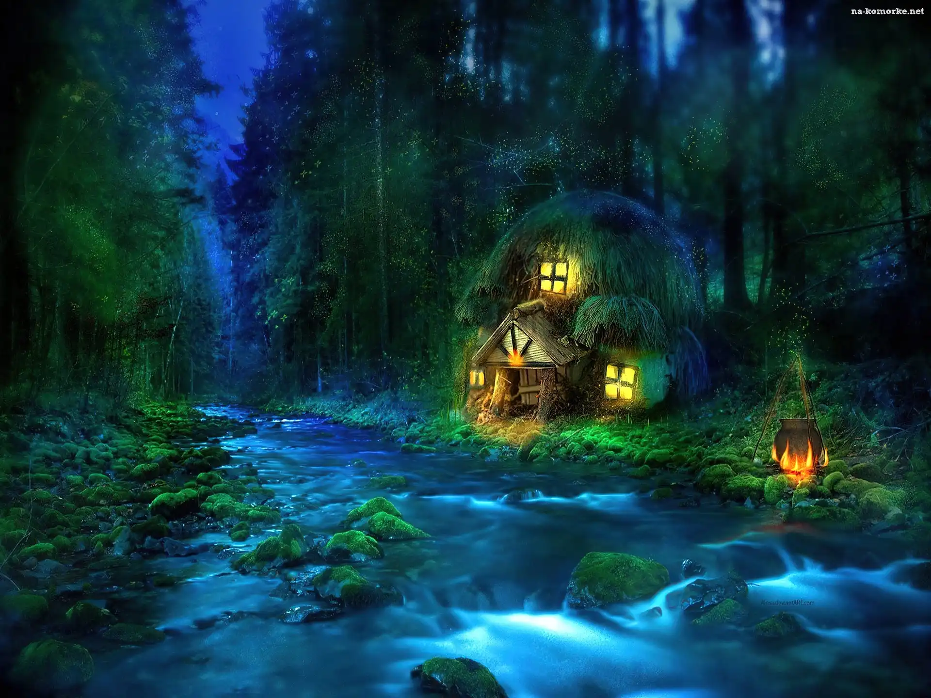 Fantasy, Las, Domek, Woda, Noc na Komórkę