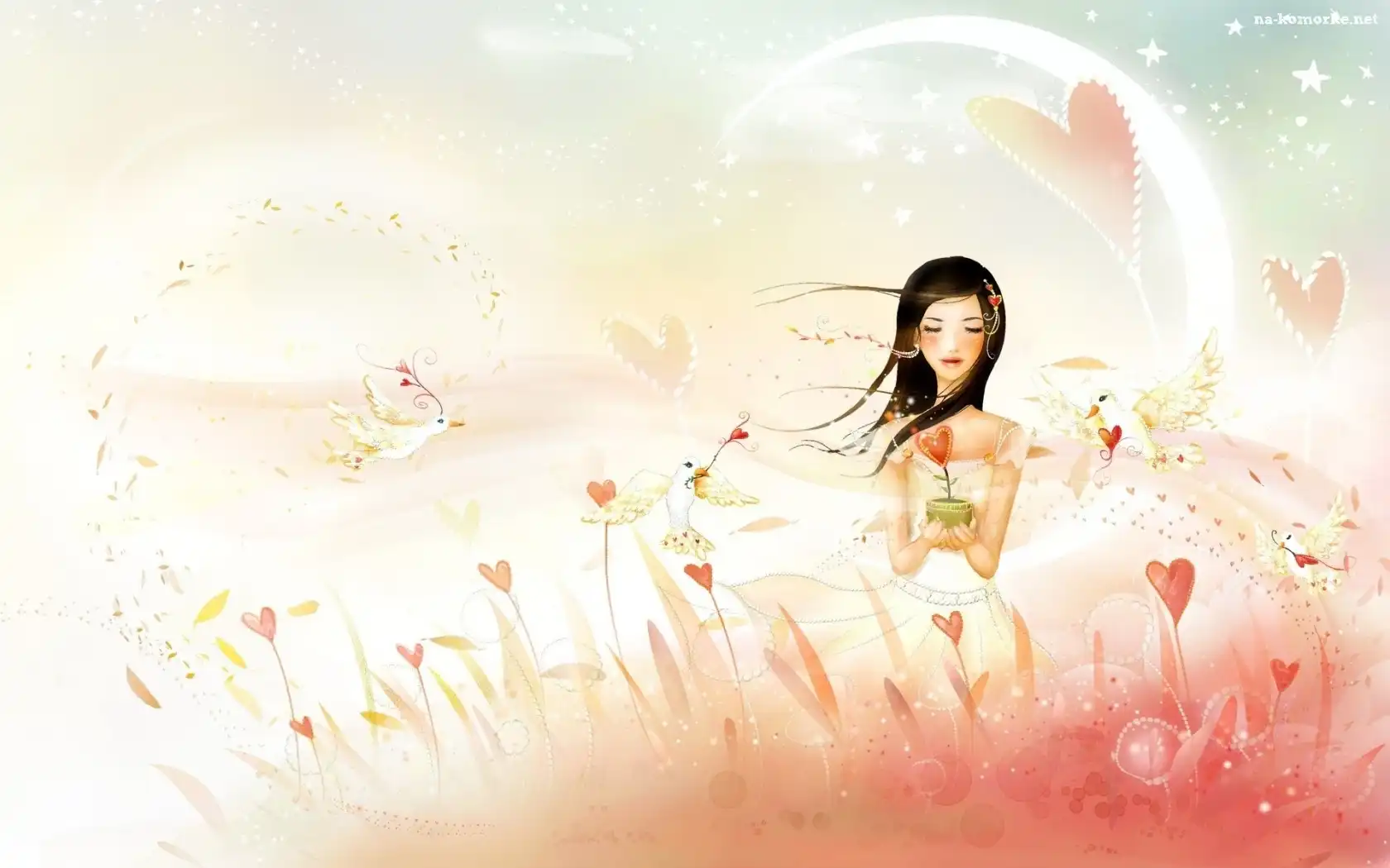 Fantazja, Kobieta, Łąka, Kwiaty, Serca na Komórkę