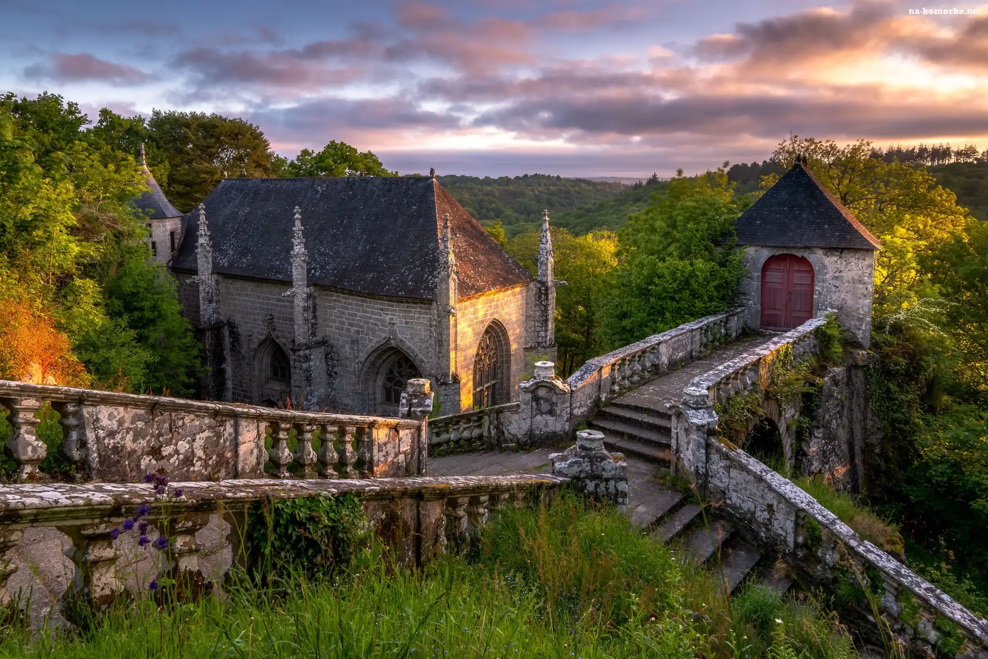 Kaplica Sainte-Barbe du Faouet, Departament Morbihan, Francja, Schody, Drzewa, Chmury, Miejscowość Le Faouet na Komórkę |
