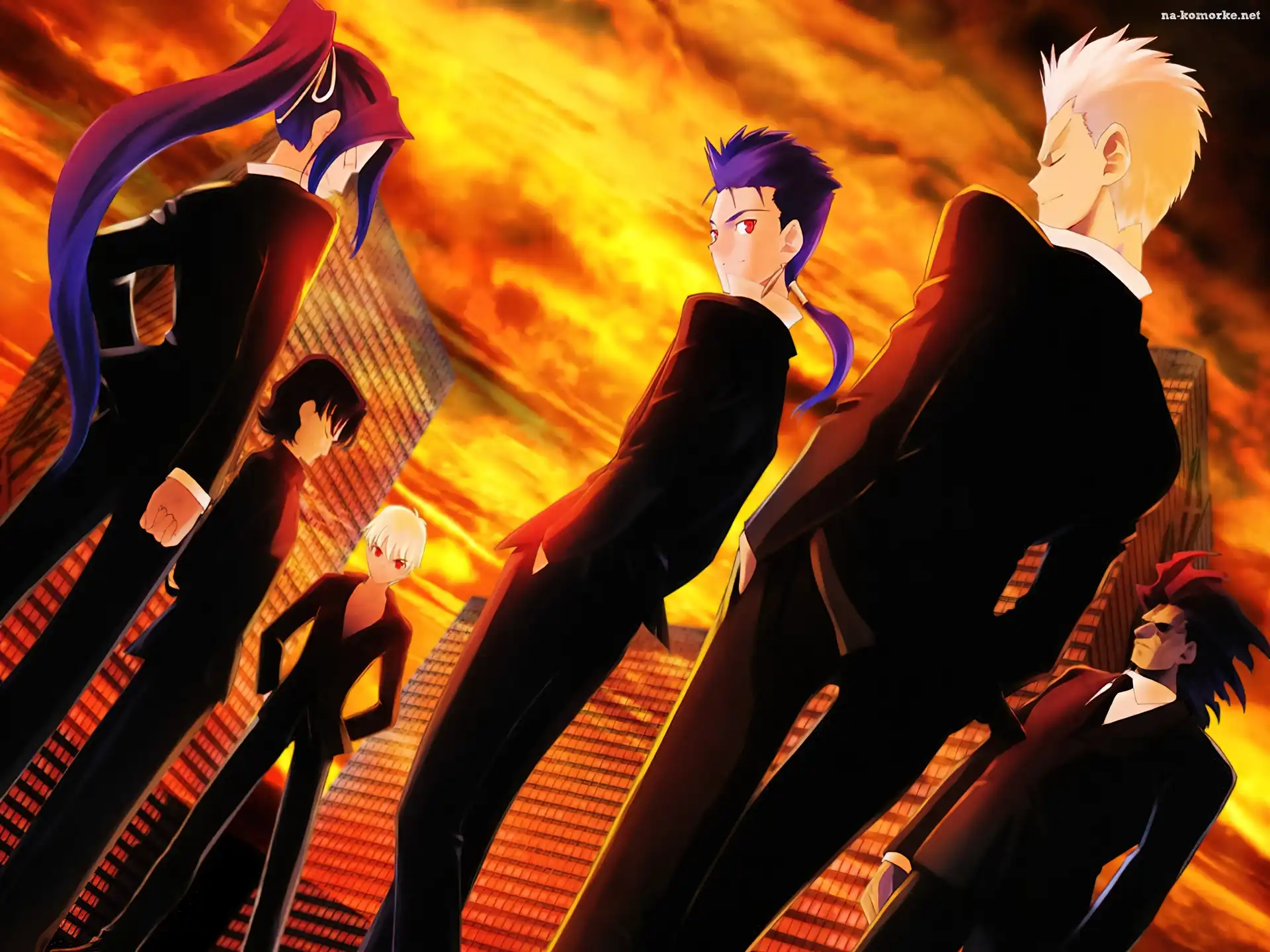 Fate Stay Night, garnitury, wieżowce, ludzie na Komórkę