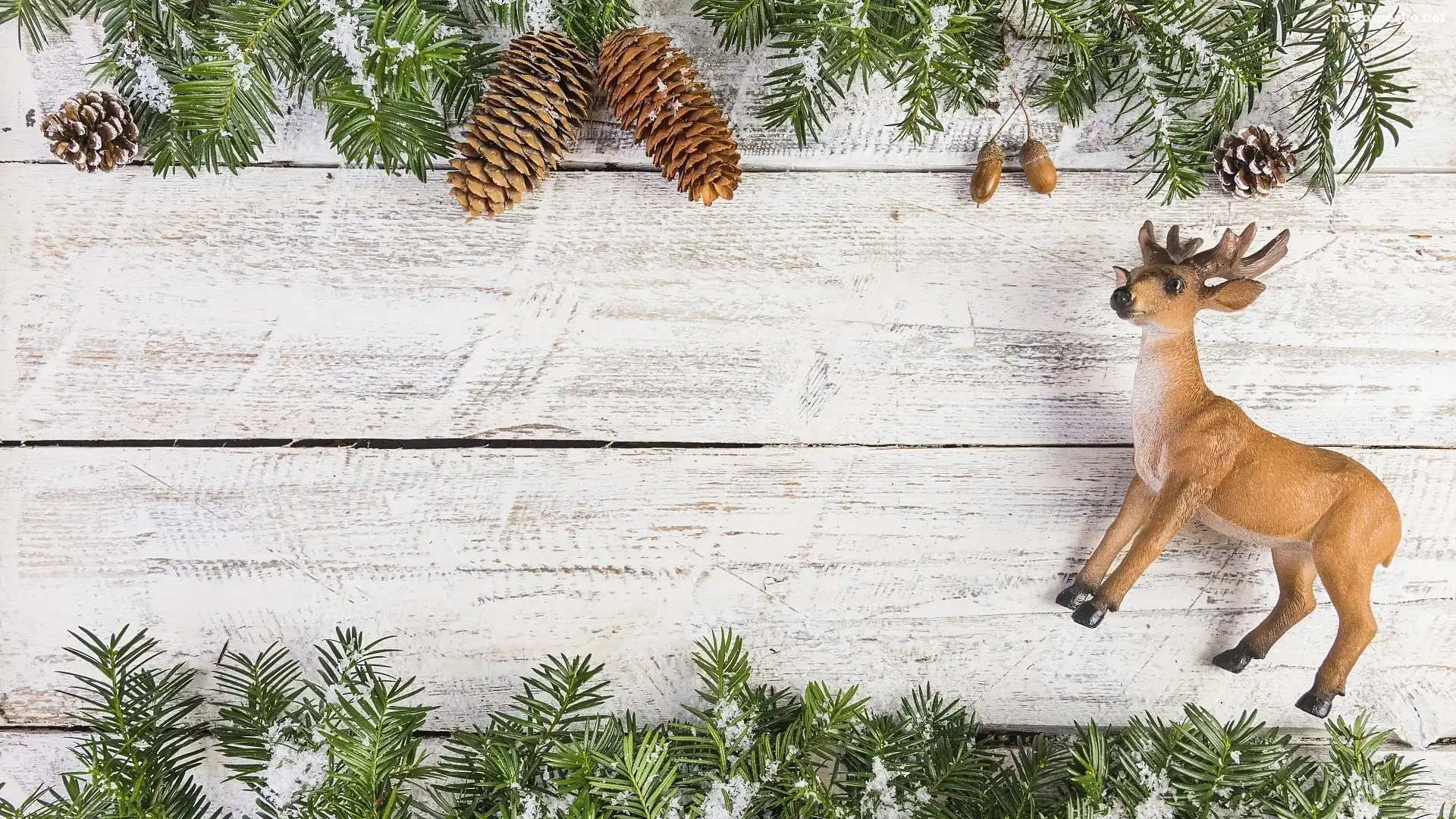 Świąteczna, Renifera, Gałązki, Deski, Kompozycja, Śnieg, Szyszki, Figurka na Komórkę