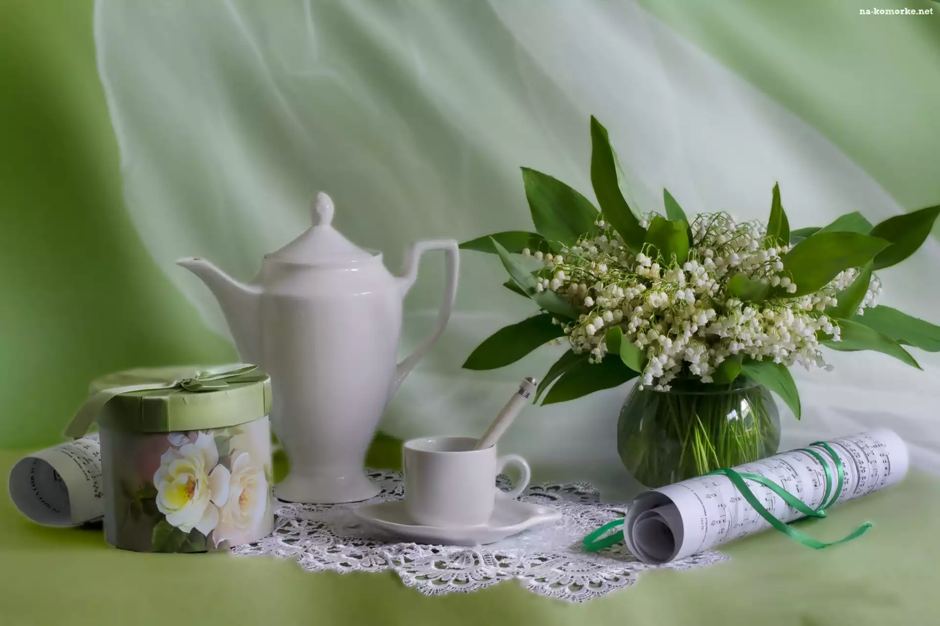 Kompozycja, Filiżanka, Nuty, Bukiet, Konwalie majowe, Flakon, Dzbanek na Komórkę