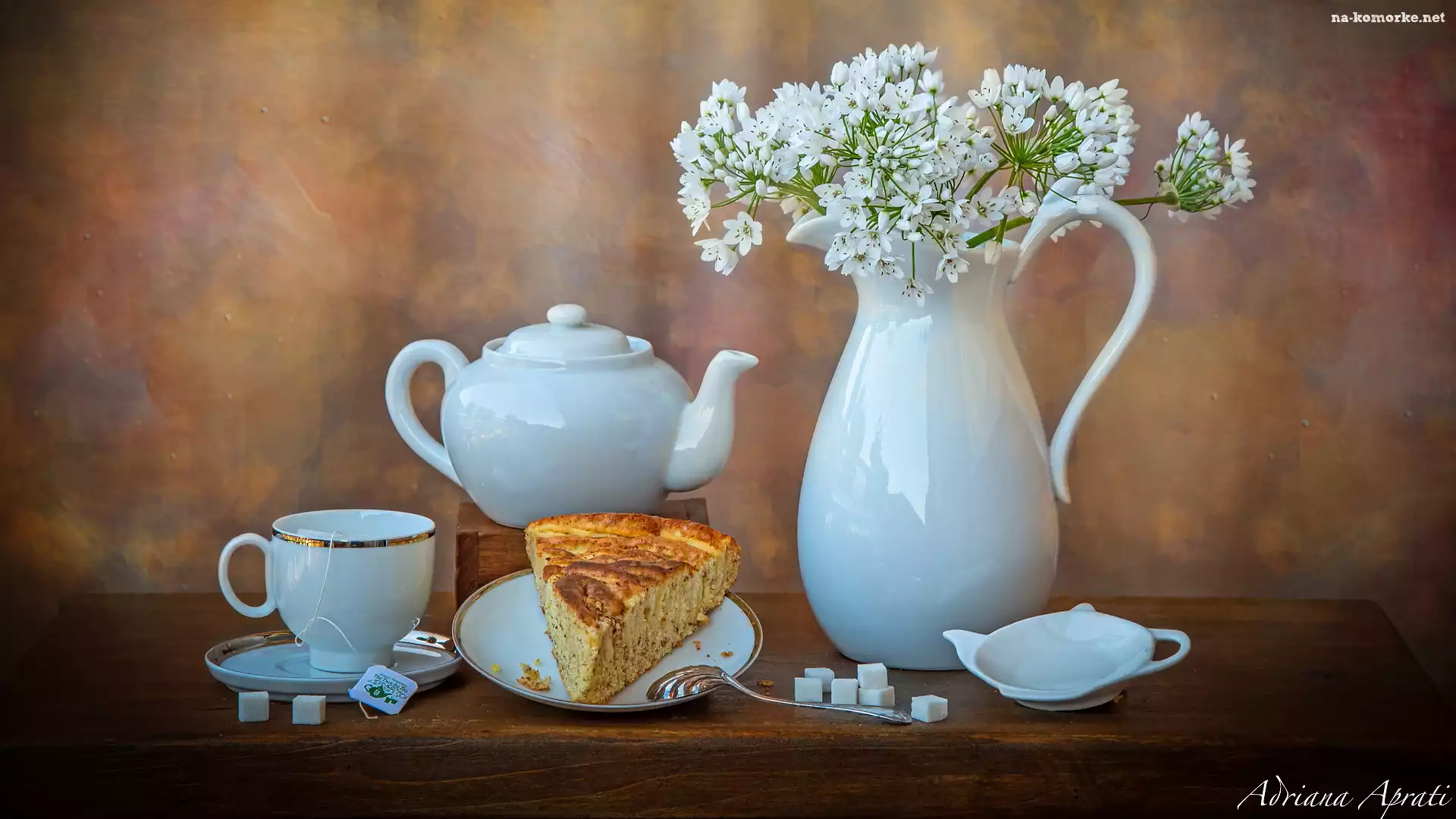 Kompozycja, Filiżanka, Ciasto, Białe, Kwiaty, Dzbanek, Imbryk na Komórkę