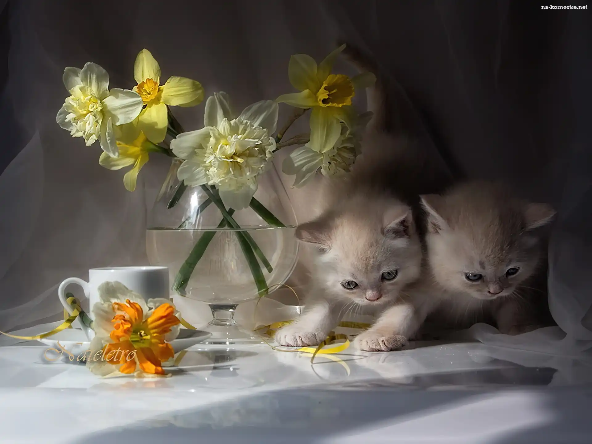 Filiżanka, Dwa, Kotki, Żonkile, Wazon na Komórkę