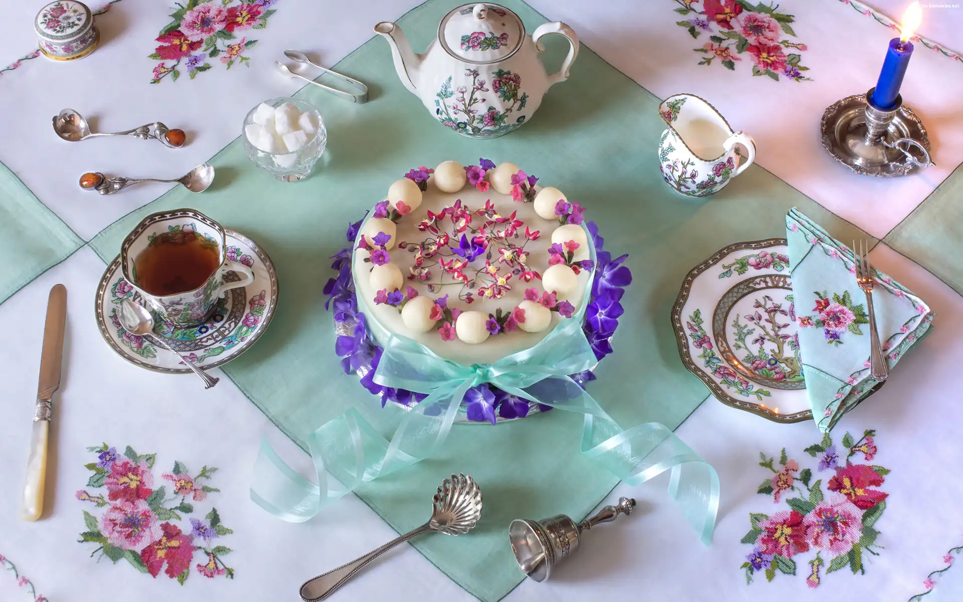 Czajniczek, Ciasto, Świece, Nóż, Serwetki, Herbata, Cukier, Łyżeczki, Filiżanka na Komórkę