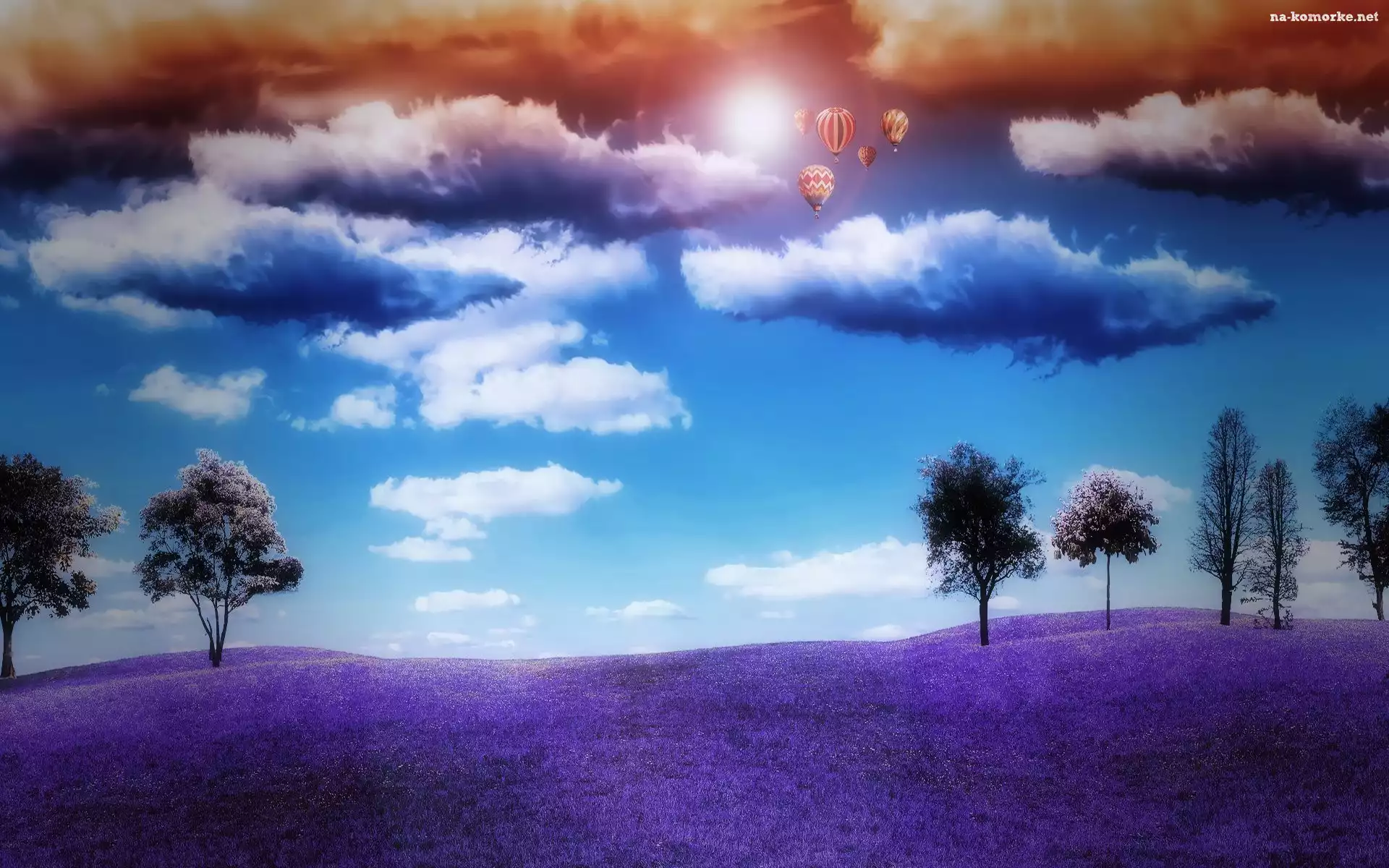 Fioletowa, Balony, Łąka, Chmury na Komórkę