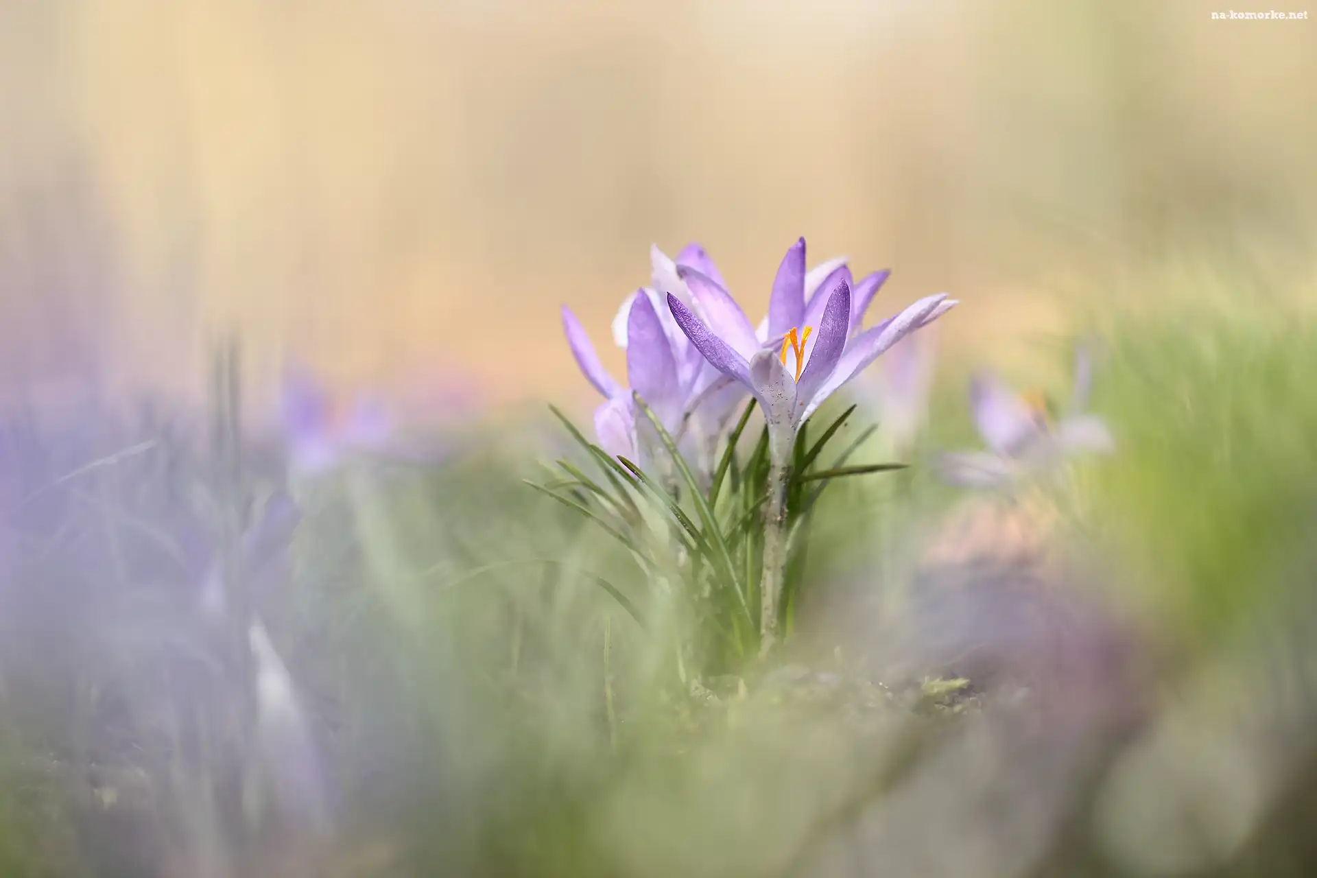 Fioletowe, Rozmyte tło, Krokusy, Zbliżenie na Komórkę