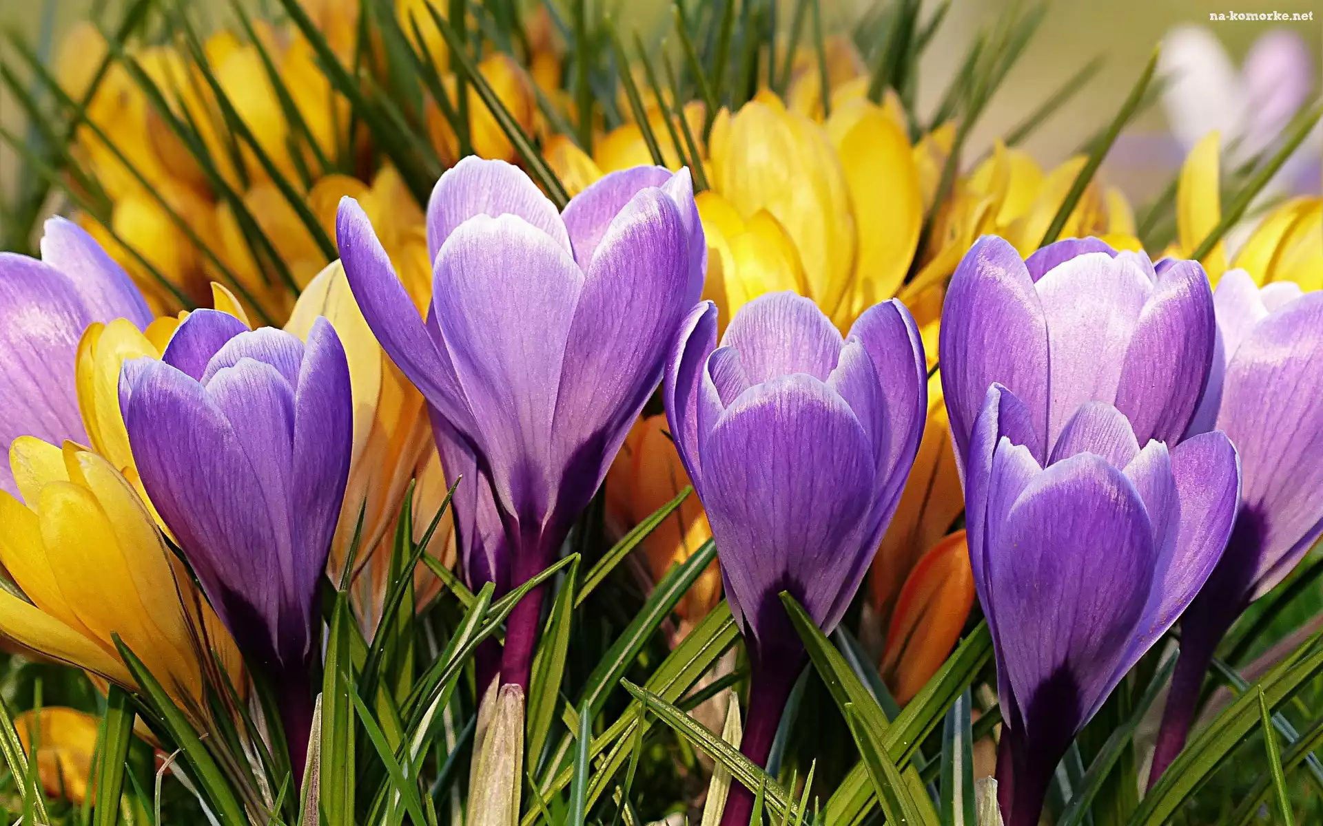 Kwiaty, Fioletowe, Krokusy, Żółte, Trawa na Komórkę
