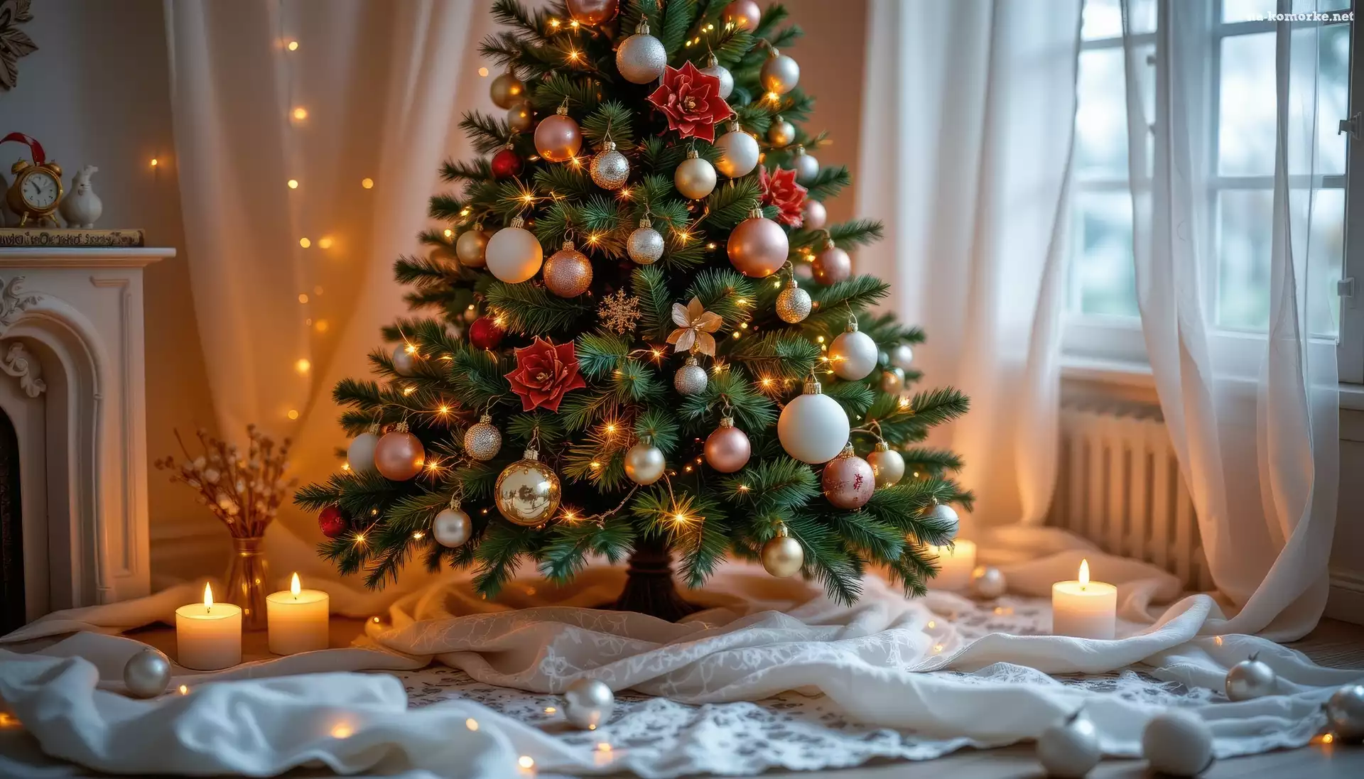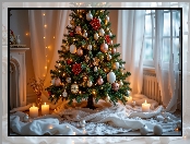 Kominek, Boże Narodzenie, Firanka, Świece, Okno, Choinka na Komórkę