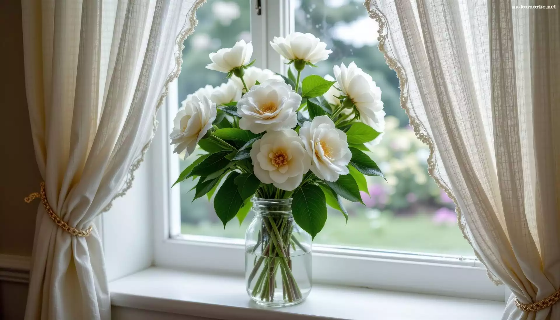 Okno, Kwiaty, Słoik, Firanki, Białe, Bukiet na Komórkę
