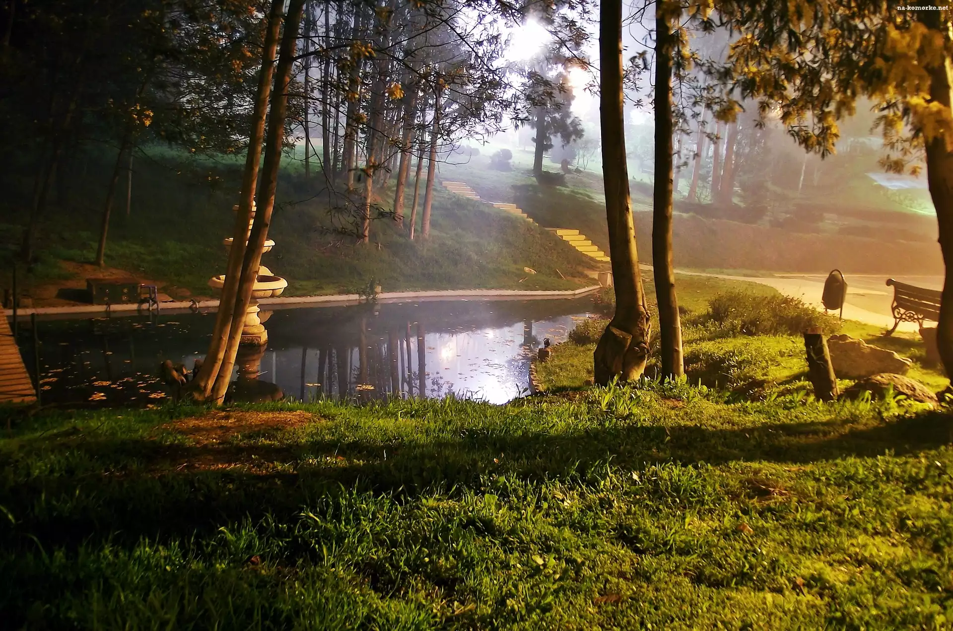 Światło, Park, Staw, Fontanna, Przebijające na Komórkę