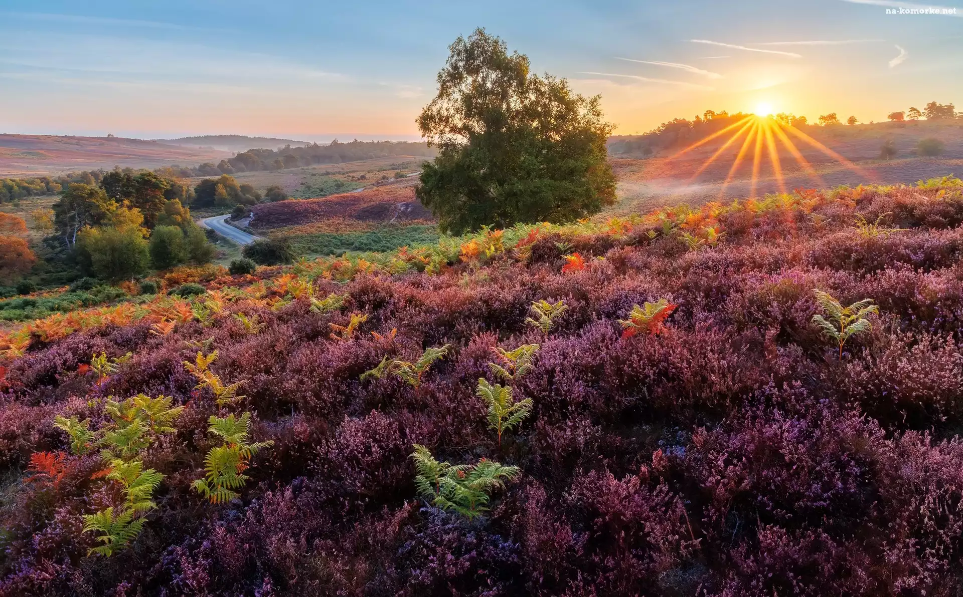 Park Narodowy New Forest, Promienie słońca, Wrzosowisko, Wielka Brytania, Paprocie, Drzewa, Wzgórze, Anglia na Komórkę |