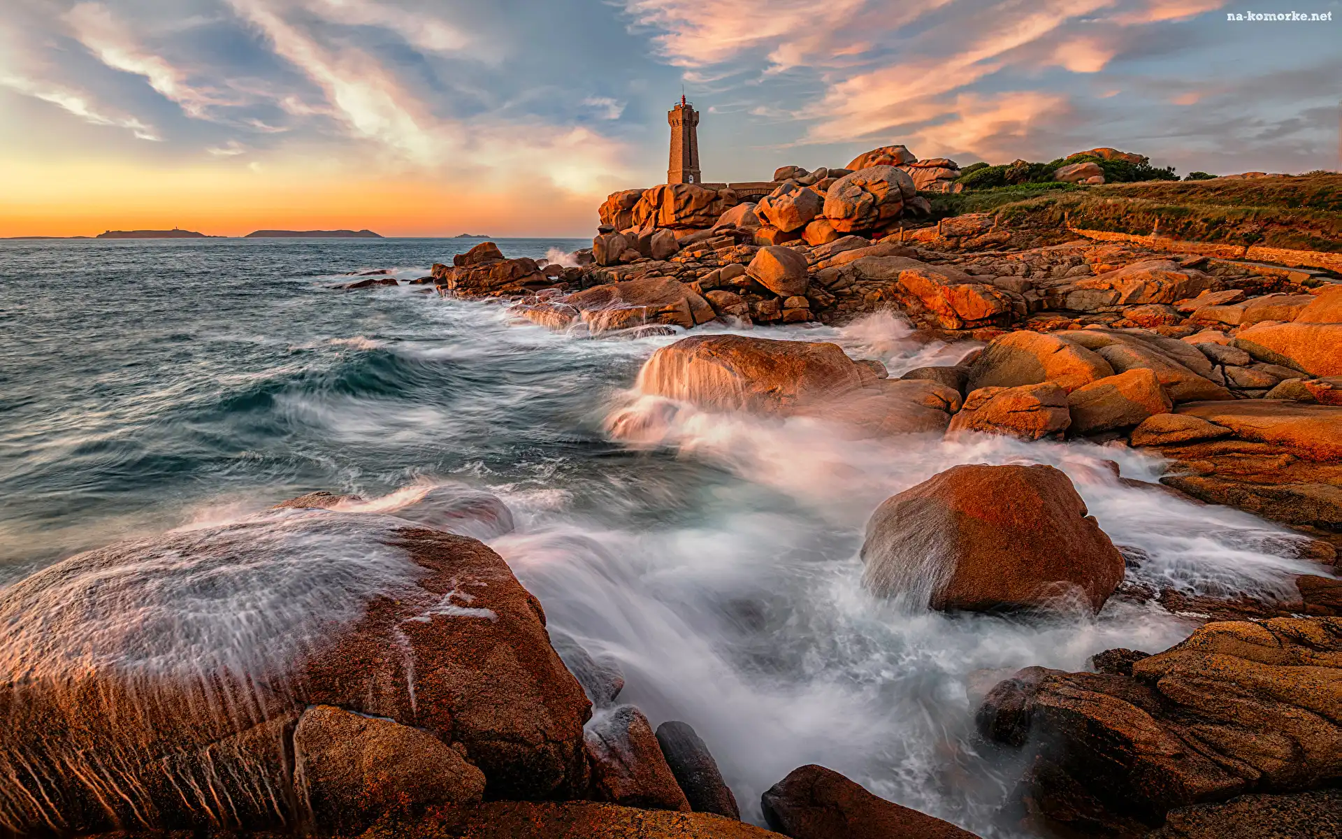 Kamienie, Wybrzeże, Morze, Skały, Francja, Latarnia morska Men Ruz, Perros-Guirec, Wschód słońca, Ploumanach na Komórkę |
