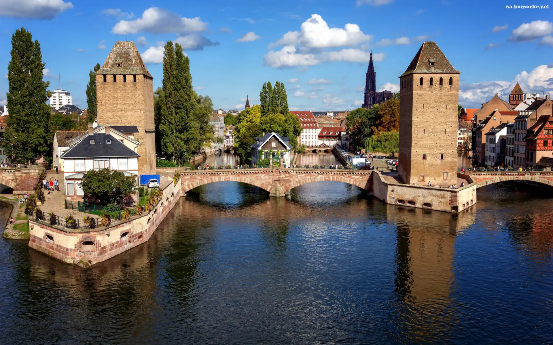 Wieże, Strasburg, Francja Budowla, Most, Barrage Vauban, Ponts Couverts, Rzeka Ill na Komórkę