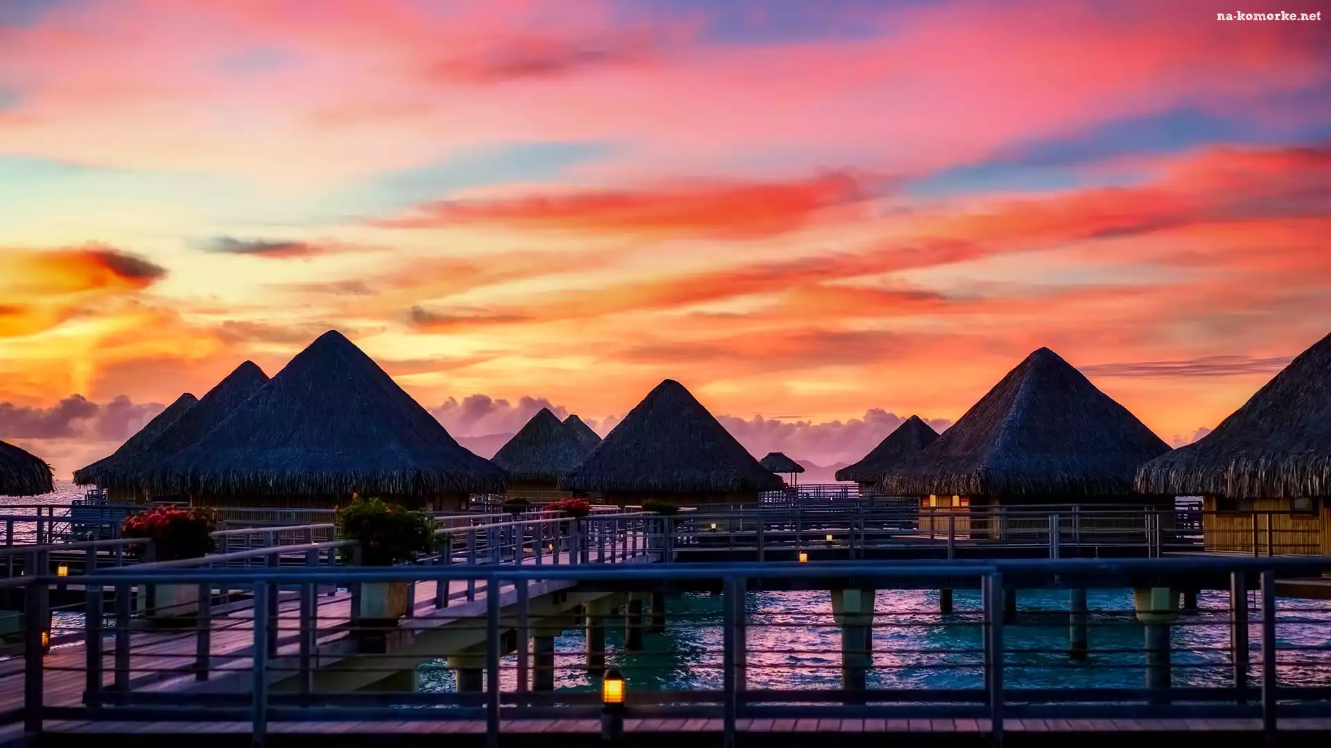 Bora Bora, Pomosty, Domki, Francja, Zachód słońca, Polinezja Francuska na Komórkę