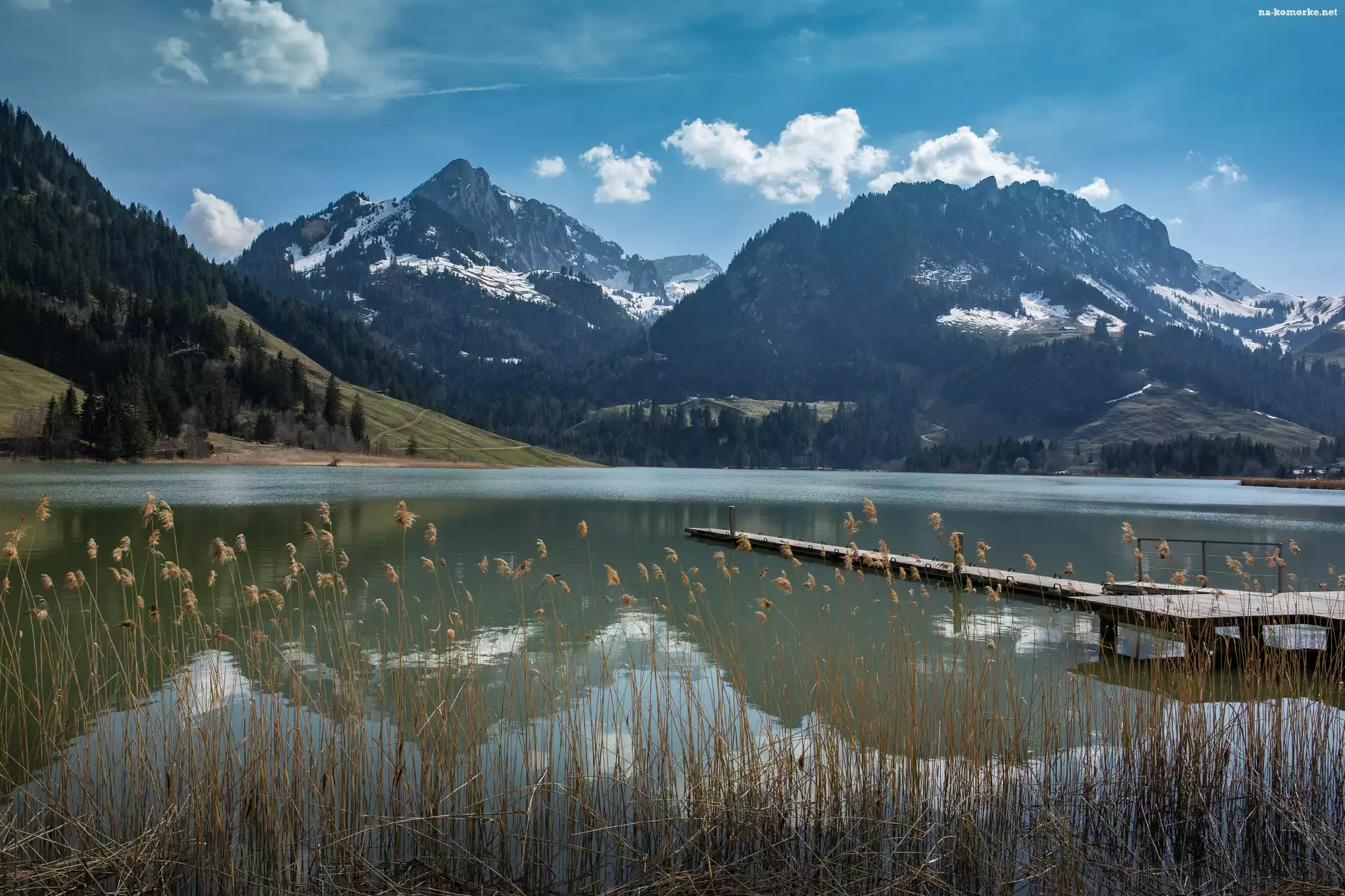 Jezioro Schwarzsee, Szwajcaria, Alpy, Pomost, Góry, Kanton Fryburg na Komórkę