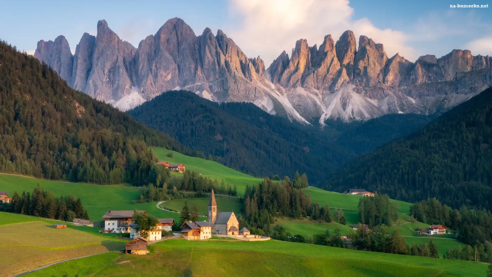 Góry, Drzewa, Val di Funes, Dolomity, Włochy, Domy, Wieś, Dolina, Santa Maddalena, Lasy, Chmury na Komórkę |