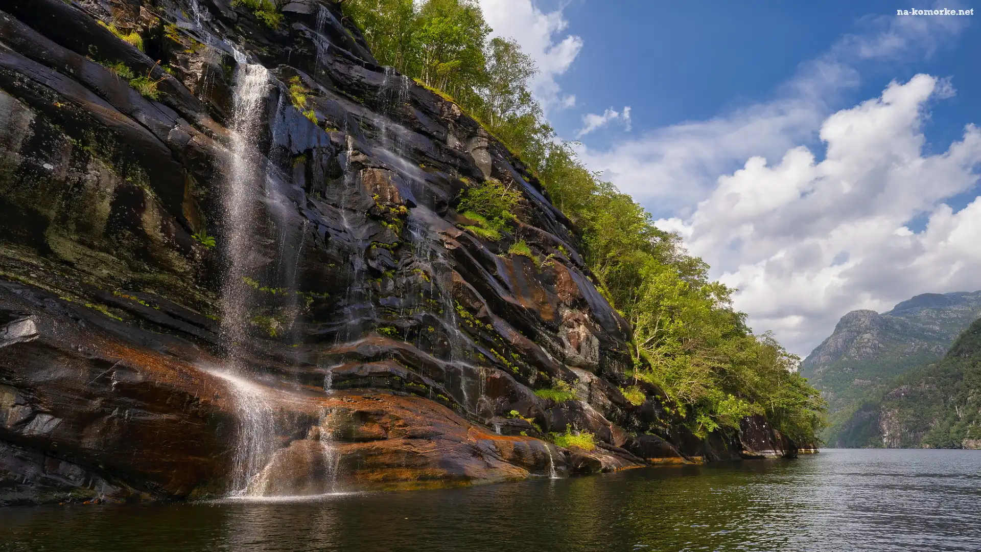 Fiord Fyksesund, Skała, Wodospad, Norwegia, Drzewa, Okręg Vestland na Komórkę