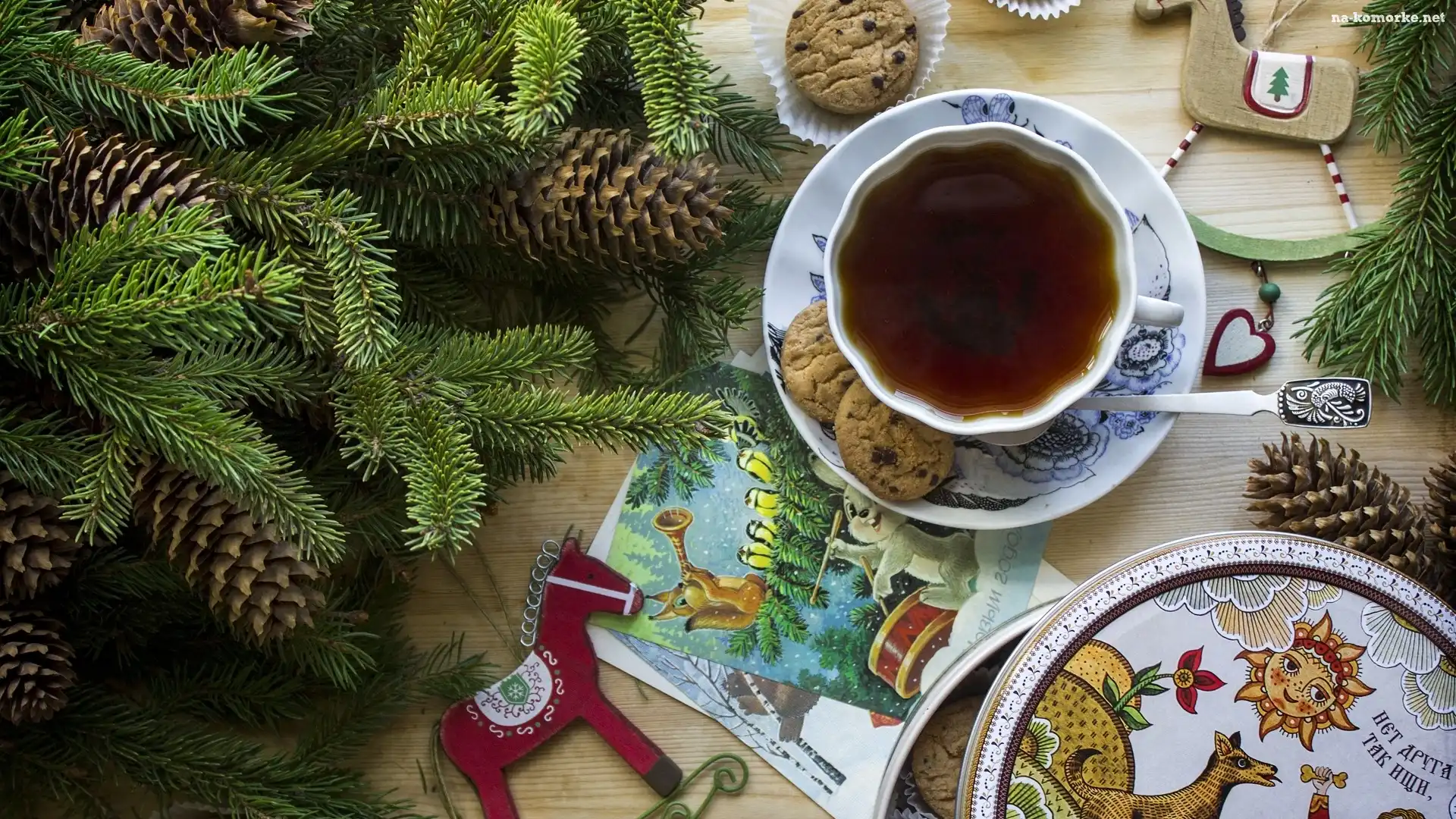 Kompozycja, Gałązki, Filiżanka, Szyszki, Herbata, Pudełko, Ciastka, Koniki na Komórkę