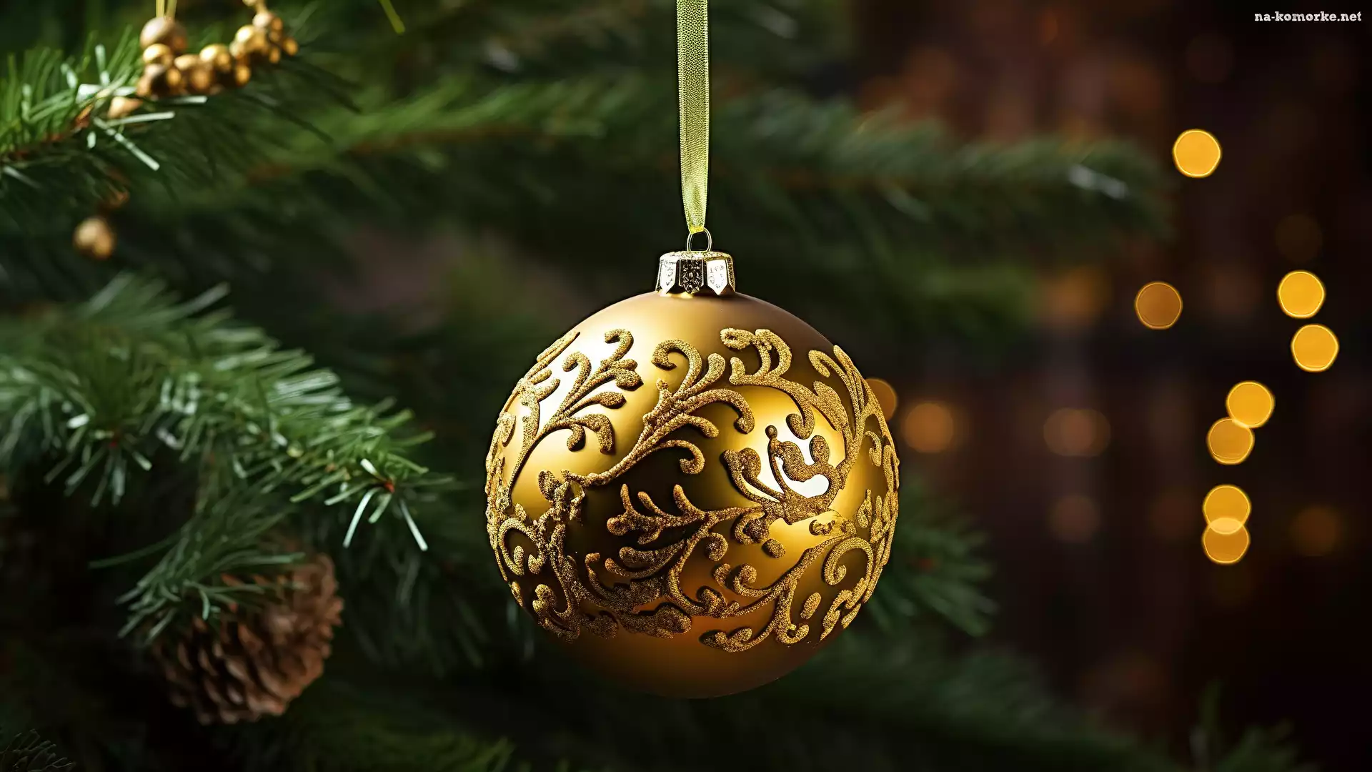 Świerkowe, Boże Narodzenie, Gałązki, Światełka, Bombka, Złota na Komórkę