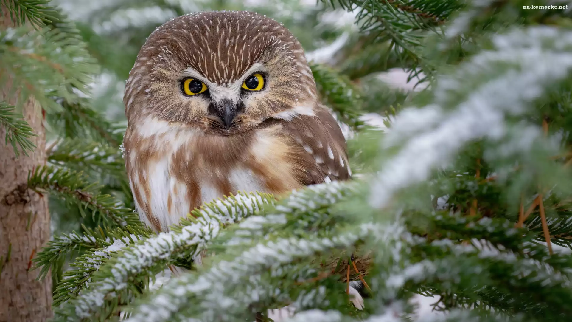 Ośnieżone, Sowa, Świerk, Gałązki, Drzewo, Włochatka na Komórkę