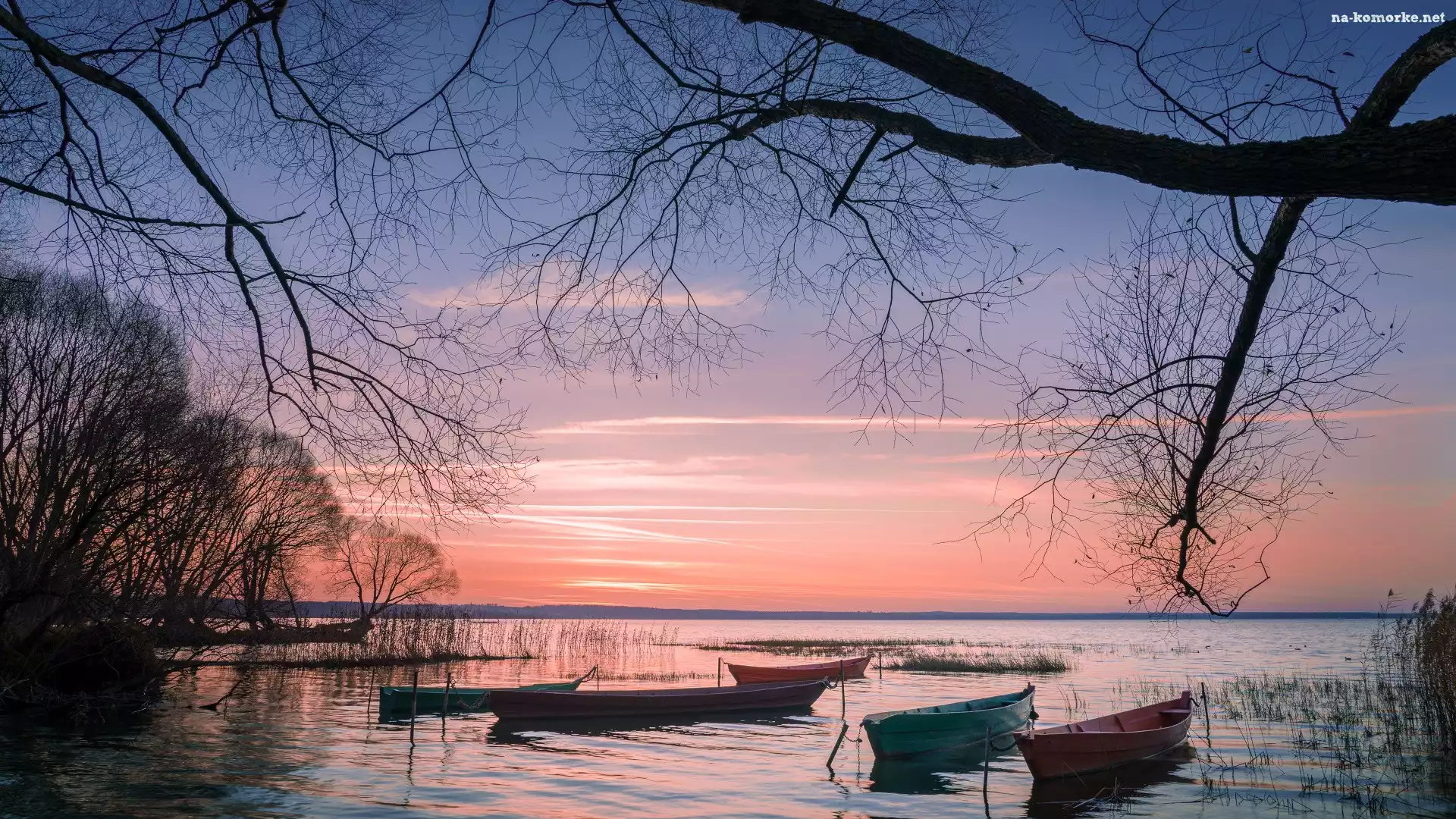 Zachód słońca, Drzewa, Gałęzie, Łódki, Jezioro na Komórkę