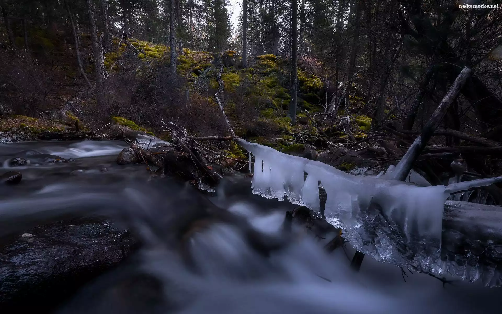 Gałęzie, Las, Rzeka, Lód, Oblodzone na Komórkę