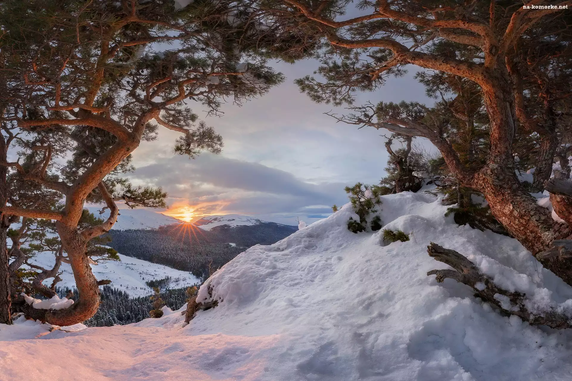 Gałęzie, Sosna, Zachód słońca, Drzewa, Śnieg, Góry, Zima, Pnie, Zaspy na Komórkę