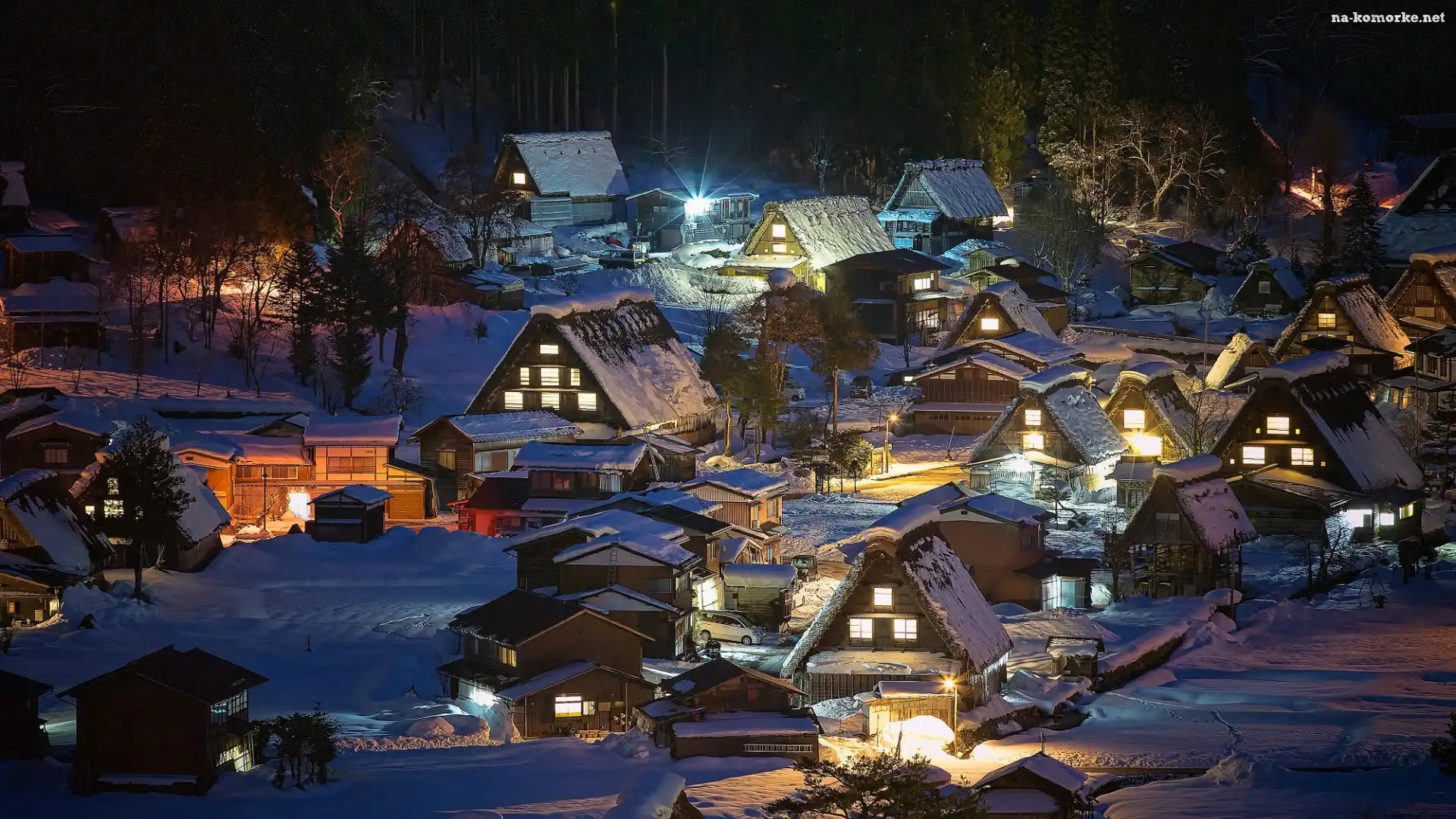 Zima, Honsiu, Japonia, Oświetlone, Domy, Wieś Shirakawa, Prefektura Gifu na Komórkę