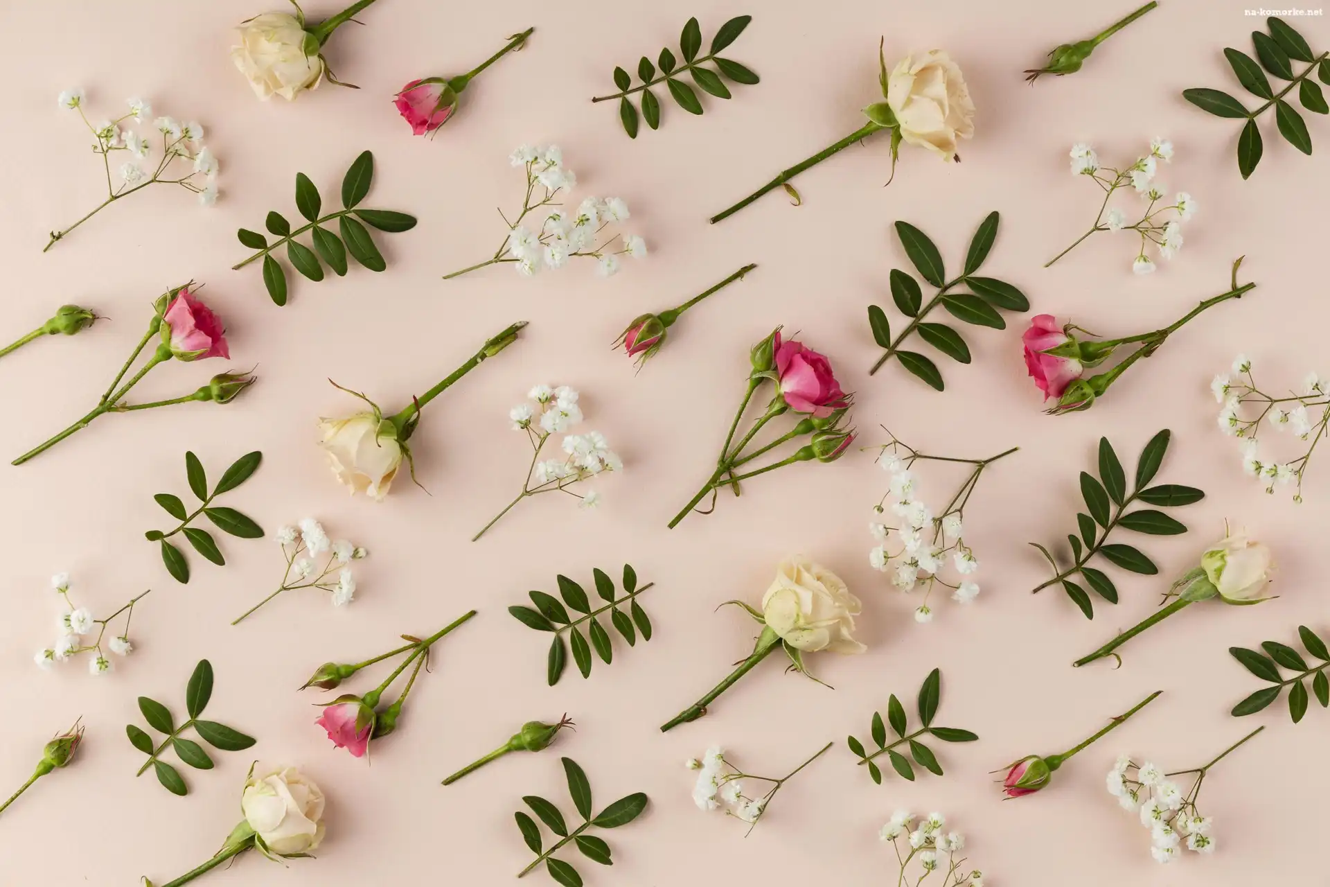 Kwiaty, Gipsówka, Liście, Róże, Białe, Czerwone, Biała na Komórkę